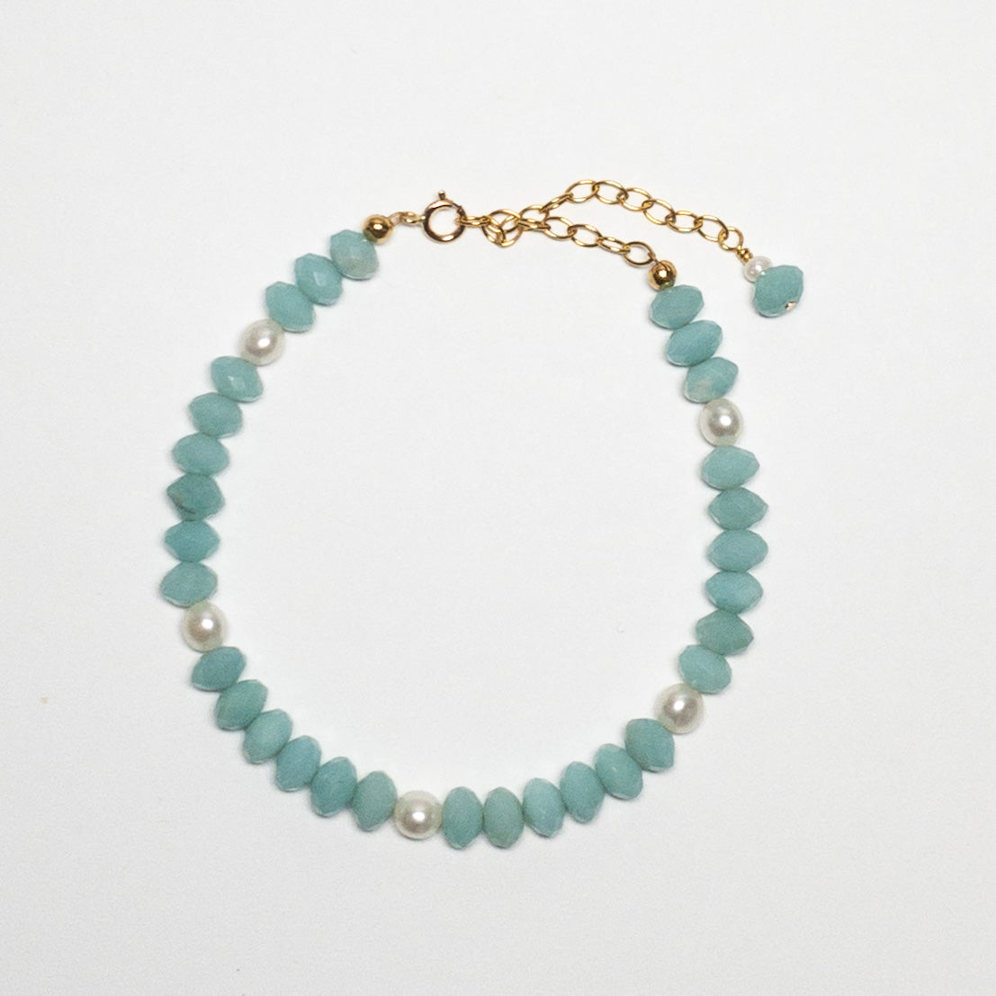 Experience the luxury and elegance of the Aquamarine and Pearl Bracelet. Its simple yet stunning design allows for easy layering, perfect for any occasion. Let these precious gems grace your wrist and make a sophisticated statement. 14K gold-filled findings. Made in USA. 6.5" long with 2" extension.