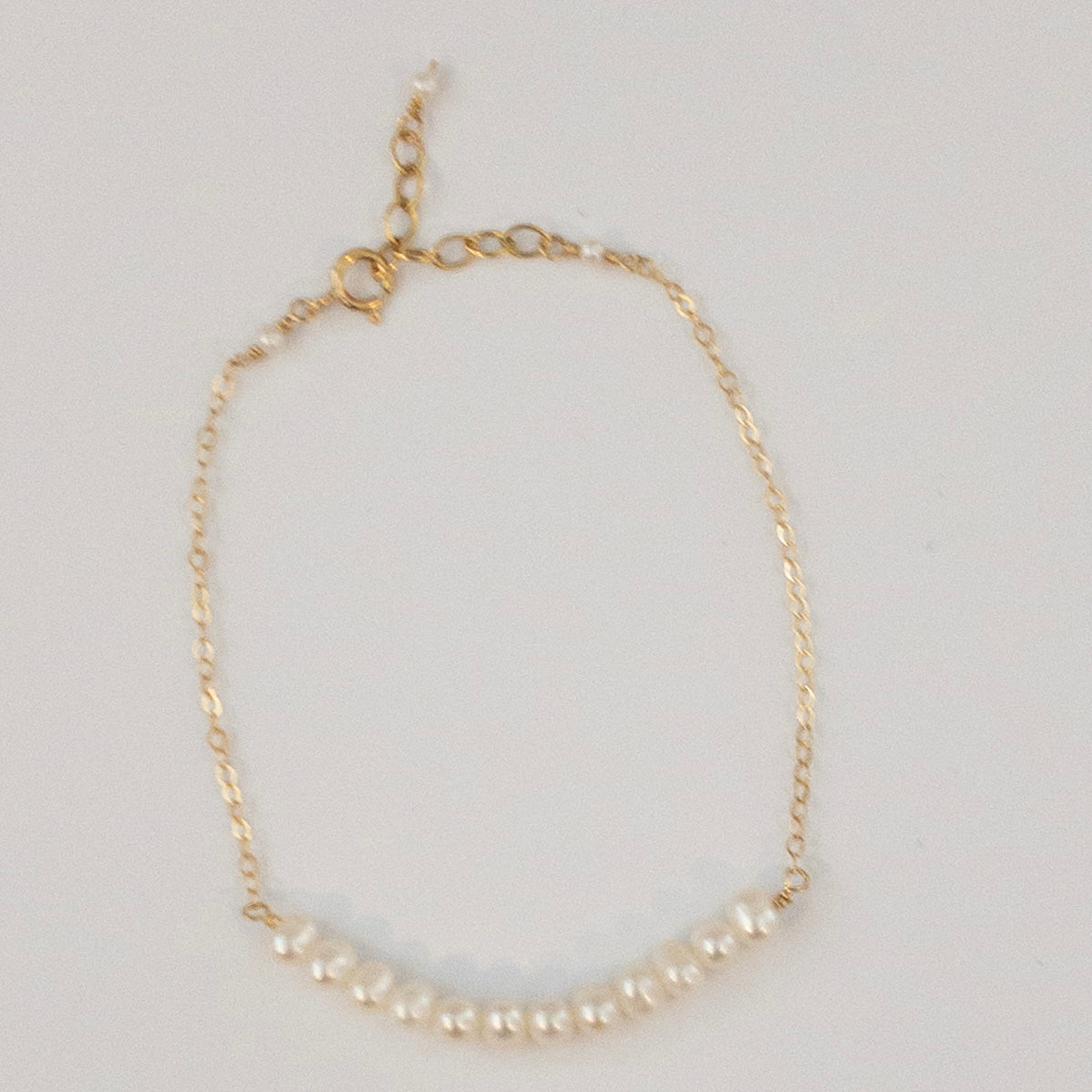 Experience the timeless elegance of our Bar of Pearls Bracelet. Adorned with a delicate bar of lustrous pearls, this bracelet is connected by a luxurious gold satellite chain. Elevate any outfit with this sophisticated and exclusive piece. 14K gold-filled spring clasp. Made in USA. 6.5" - 7.5" long.