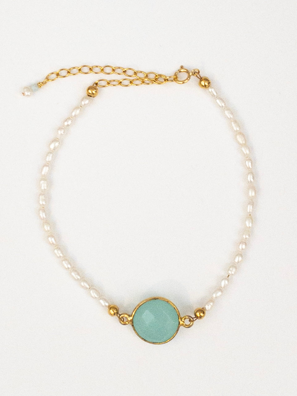 Indulge in the luxurious elegance of our Chalcedony and Pearl Bracelet. The center features a stunning faceted Chalcedony gem, surrounded by delicate rice pearls strung together in a timeless design. Perfect for adding a touch of sophistication to any outfit. 14K gold-filled findings. Made in USA. 6.5" long with 2" extension.