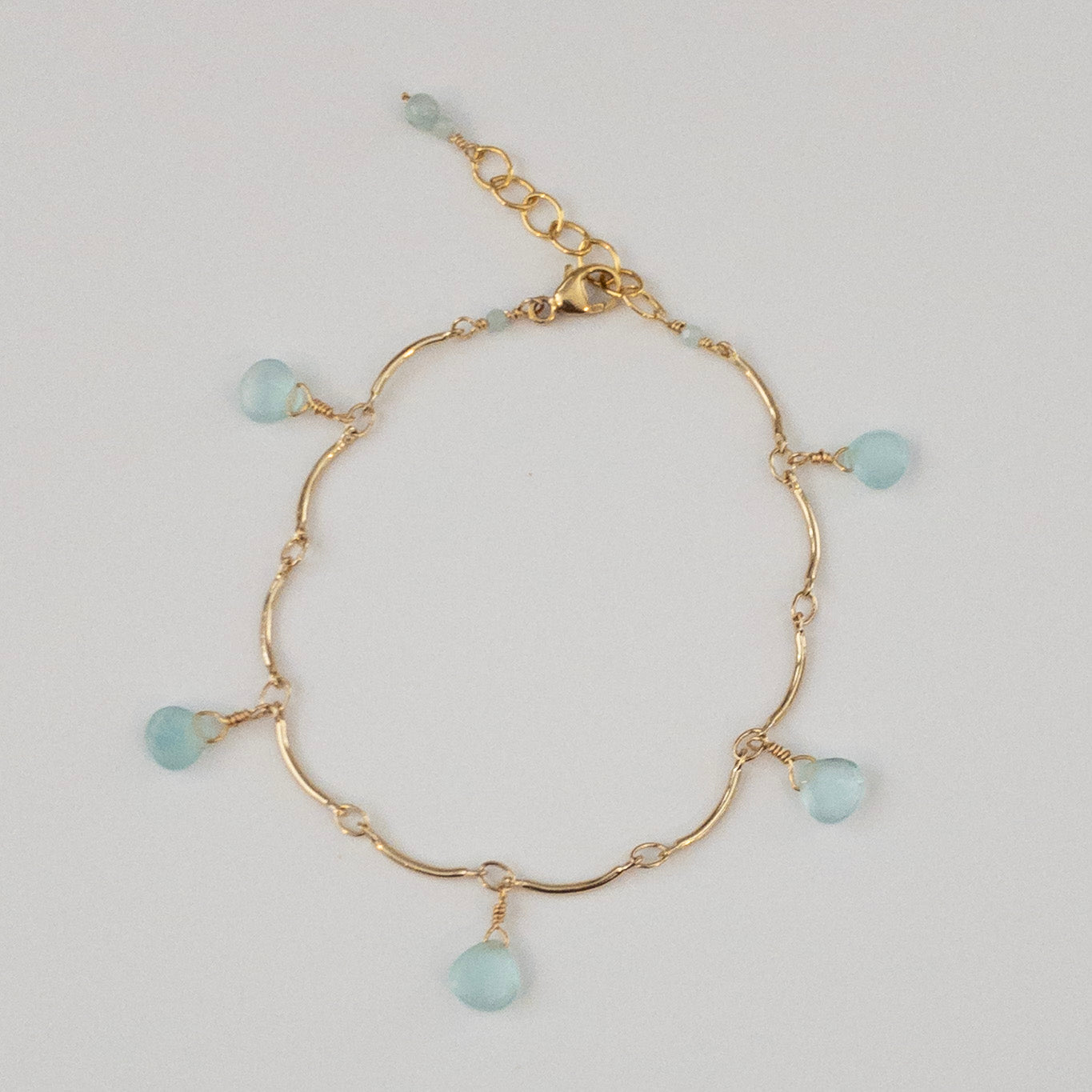 Elevate your jewelry collection with our Chalcedony Raindrop Bracelet. This exquisite piece features teardrop gems delicately hanging from a curved gold bar chain, adding a touch of sophistication and luxury to any outfit. Make a statement with this exclusive bracelet. 14K gold-filled lobster clasp. Made in USA. 6.5" - 7.5" long.