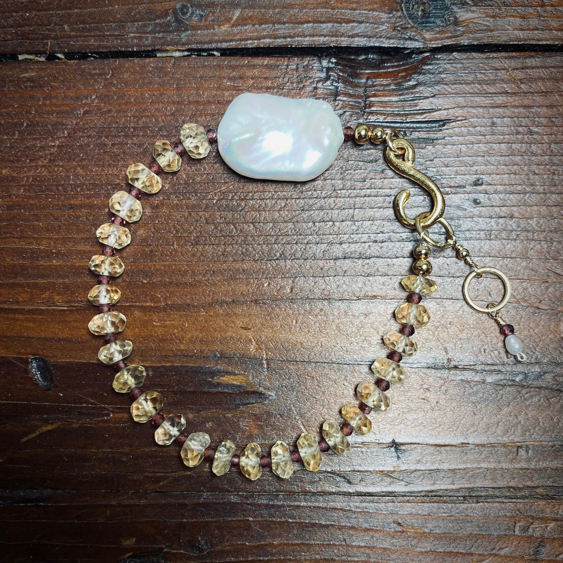 This bracelet elegantly combines citrine and garnet beads, accentuated by a striking cultured freshwater pearl. A perfect statement piece. Gold vermeil clasp. Adjustable. 7" - 8" long. Made in USA.