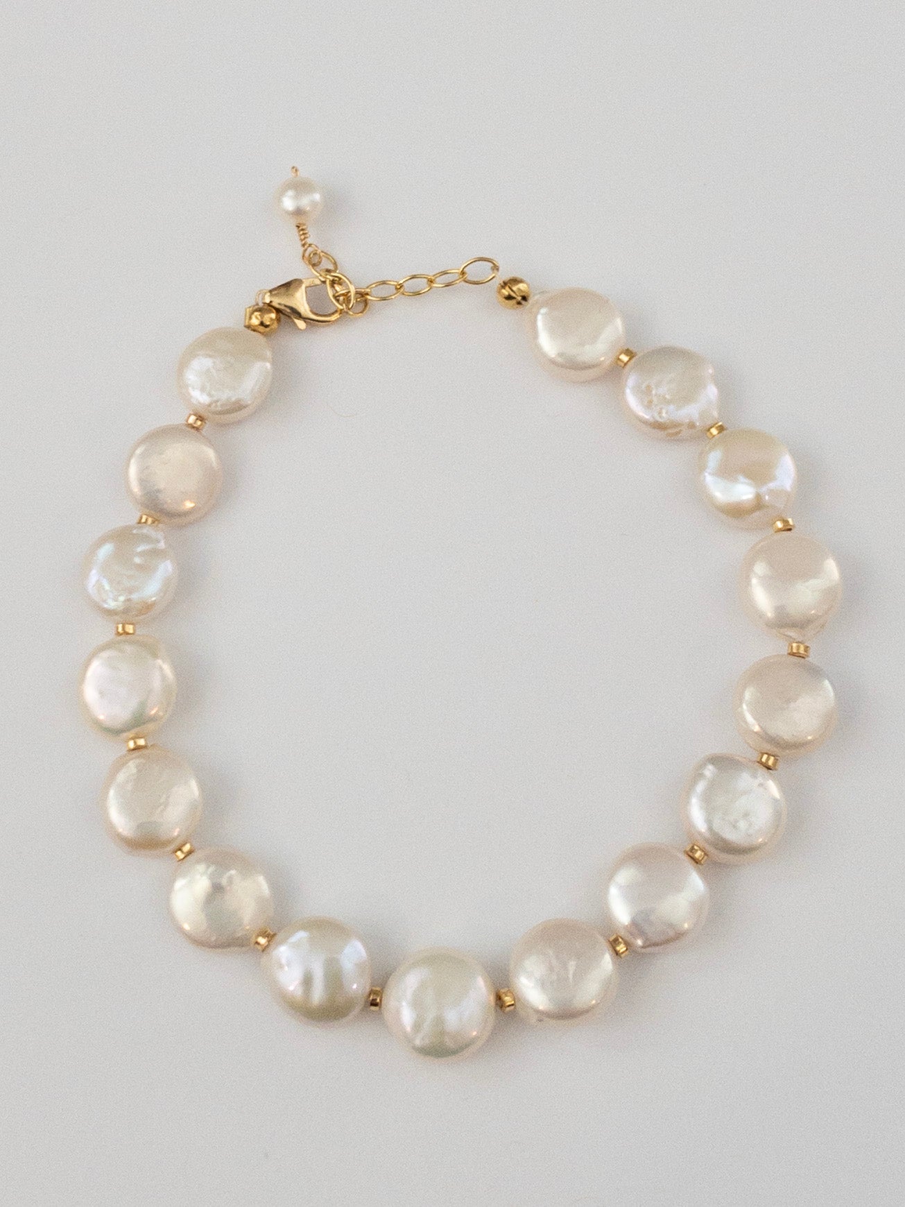 Indulge in the opulent elegance of this Coin Pearl Bracelet. Delicate coin pearls are beautifully interspersed with gleaming gold beads, creating a luxurious and sophisticated accessory. Adorn your wrist with this unique blend of classic and modern design, perfect for any upscale occasion. 14K gold-filled lobster clasp. 6.5" - 8" long. Made in USA