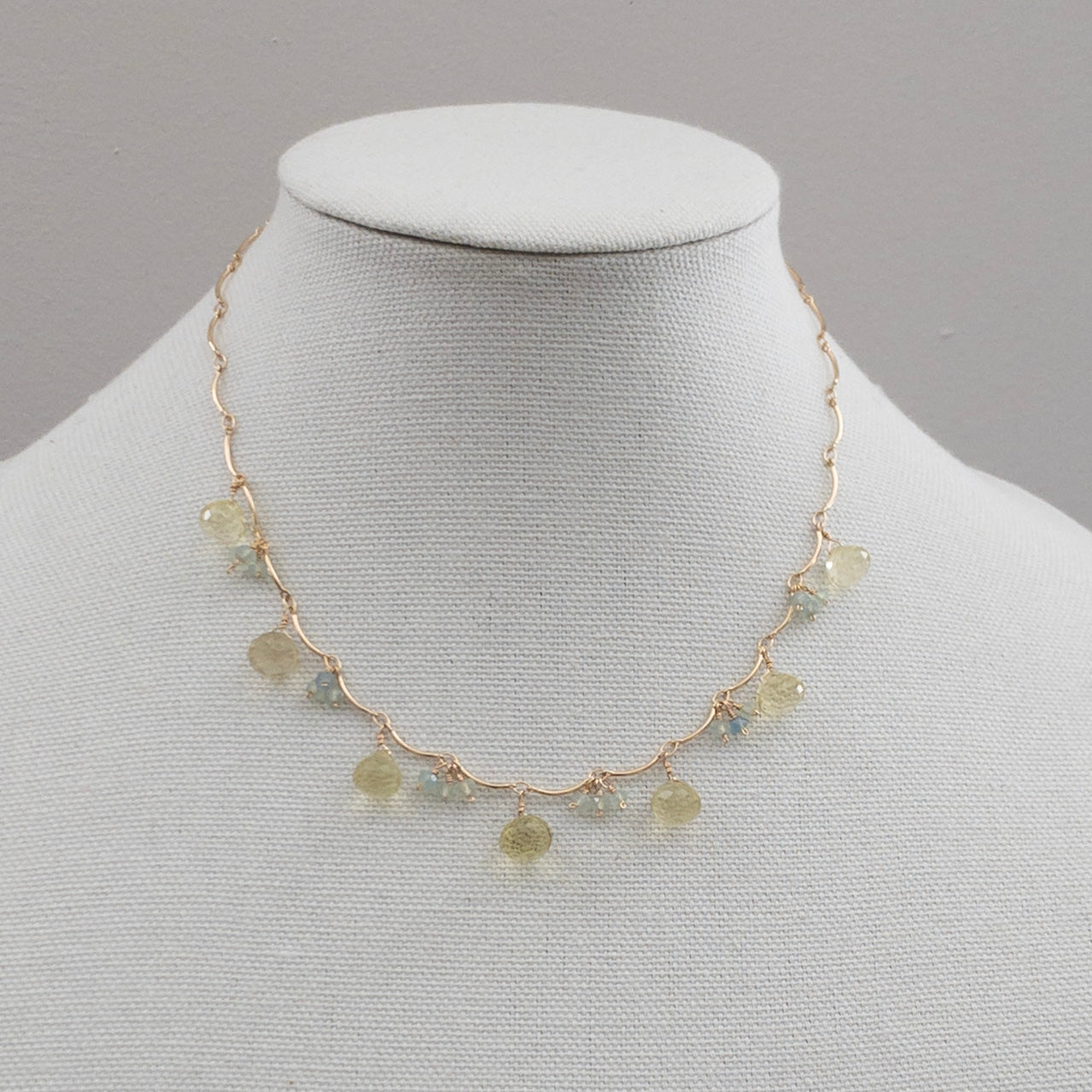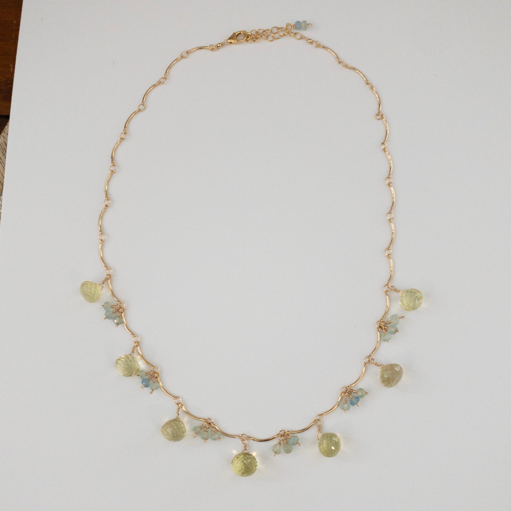 Indulge in the luxurious charm of our Lemon Quartz Necklace. Witness the vibrant beauty of dancing lemon quartz briolites, perfectly complemented by delicate clusters of aquamarine. Adorned on a curved gold bar chain, this exquisite piece is a true ode to sophistication and elegance. Elevate your style with this exclusive necklace. 14K gold-filled lobster clasp. Made in USA. 16" long with 2" extension.