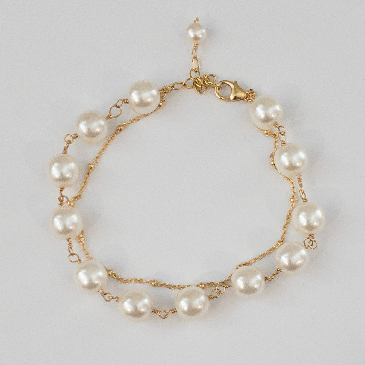 This elegant bracelet features a blend of delicate 14K gold-filled satellite chain and a second strand of wire wrapped freshwater pearls, creating a sophisticated dual-layered design. 14K gold-filled lobster clasp. Adjustable 6.5" - 8" long. Made in USA.