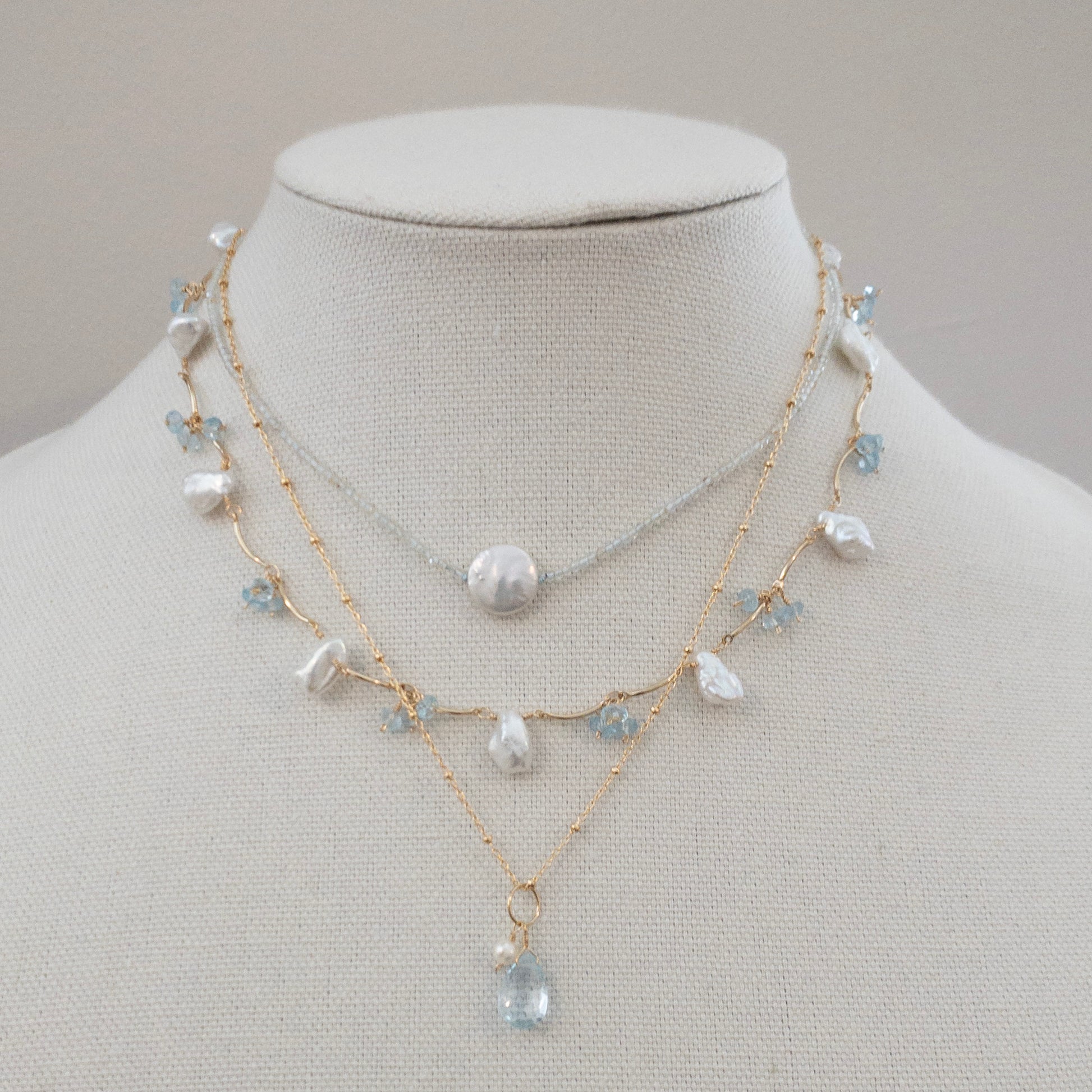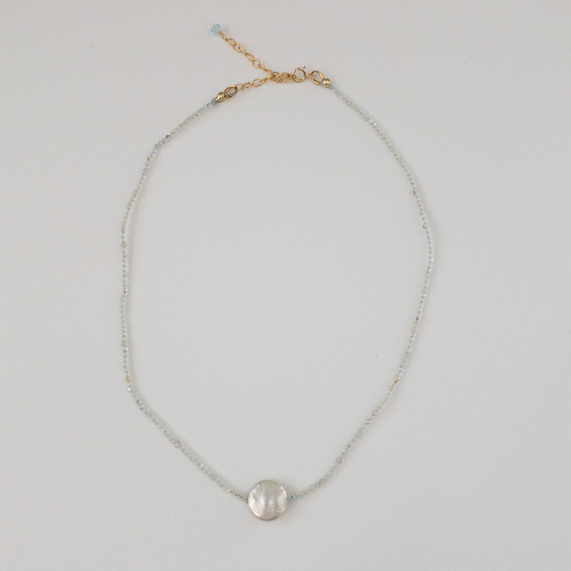 Indulge in luxury with the Full Moon Necklace. A solitary coin pearl adorns a delicate string of aquamarine, carefully strung on light blue silk floss. Elevate your style with this elegant and exclusive piece, perfect for any occasion. Feel the sophistication and beauty with every wear. Great layering piece. 14K gold-filled spring clasp. Made in USA. 14" long with 2" extension.