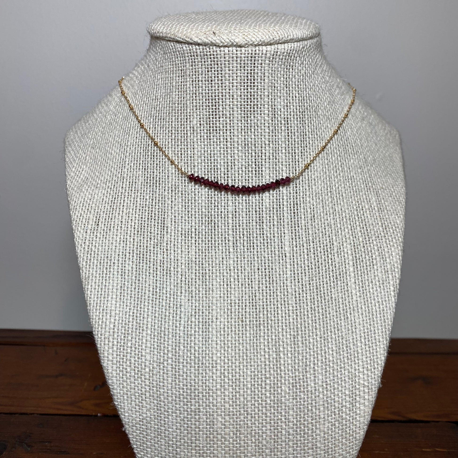 Add a touch of sophistication to your style with our Garnet and 14K Gold Filled Bar Necklace. This graceful piece features a stunning row of garnet gemstones, January's Birthstone, strung on an elegant gold filled chain. Elevate any outfit effortlessly when you wear this piece alone or layered. 14K gold-filled spring clasp. Made in USA. 16" long with 2" extension.