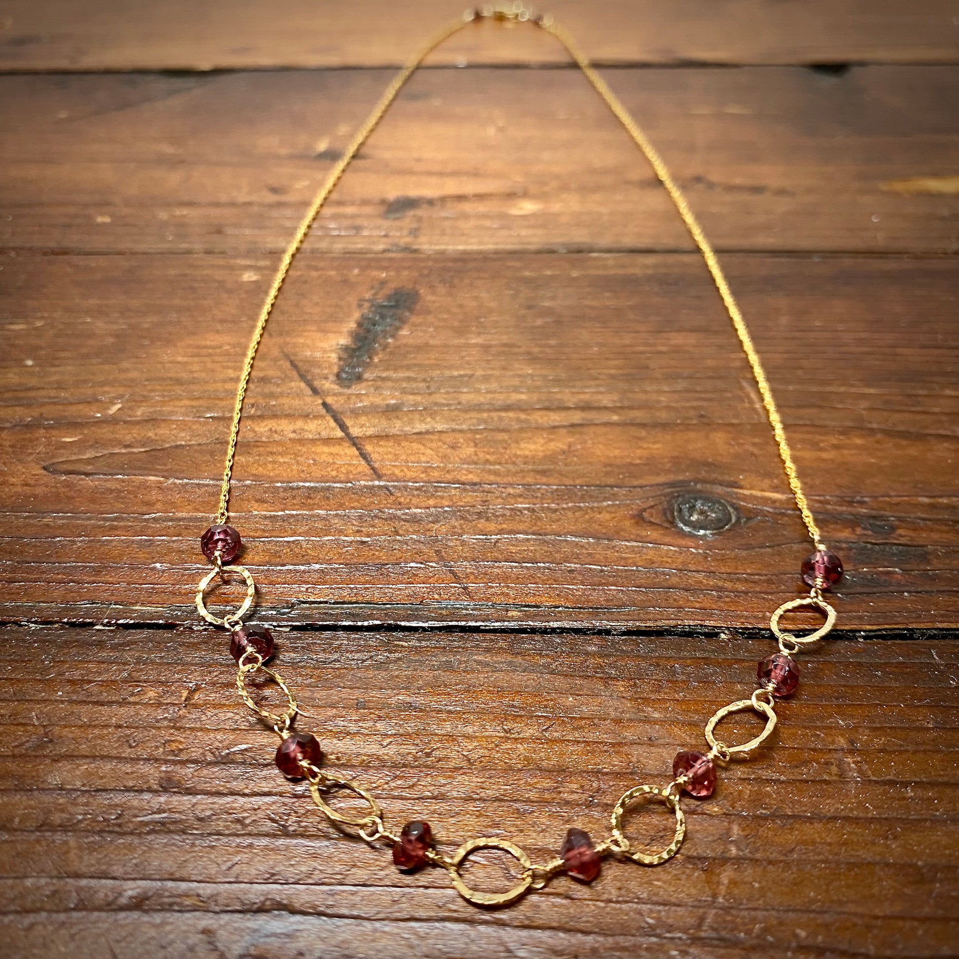 Presenting our elegant Singapore chain embellished with garnet gemstones and intricately hammered circle links. This versatile necklace exudes timeless sophistication, perfect for making a statement on its own or layering with other favorites. Effortlessly elevate your style with this refined piece that adds understated beauty to any ensemble. 14K gold-filled lobster clasp. Made in USA. 20" long.
