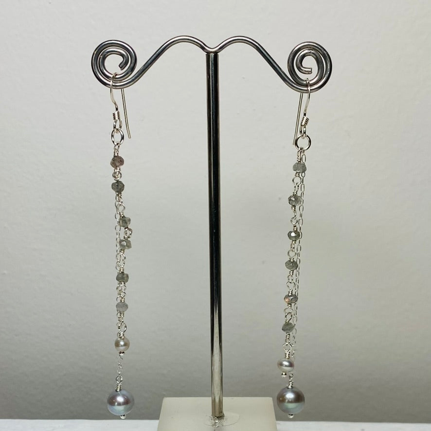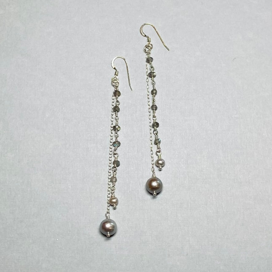 Indulge in the opulence of our Gray Pearls and Labradorite Earrings. The sophisticated design features a delicate chain adorned with a lustrous gray pearl and a row of stunning labradorite gems. Elevate your style with these exclusive earrings that exude elegance and refinement. 3" long. Made in USA.