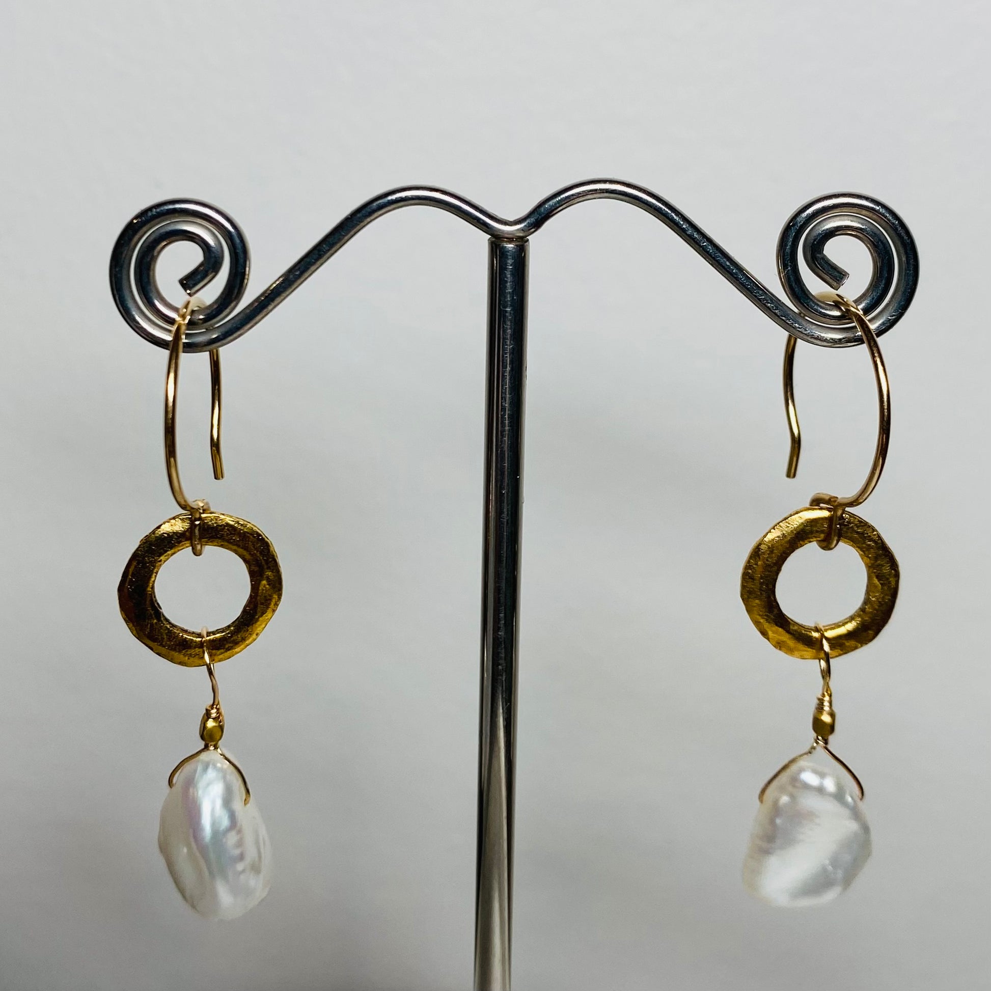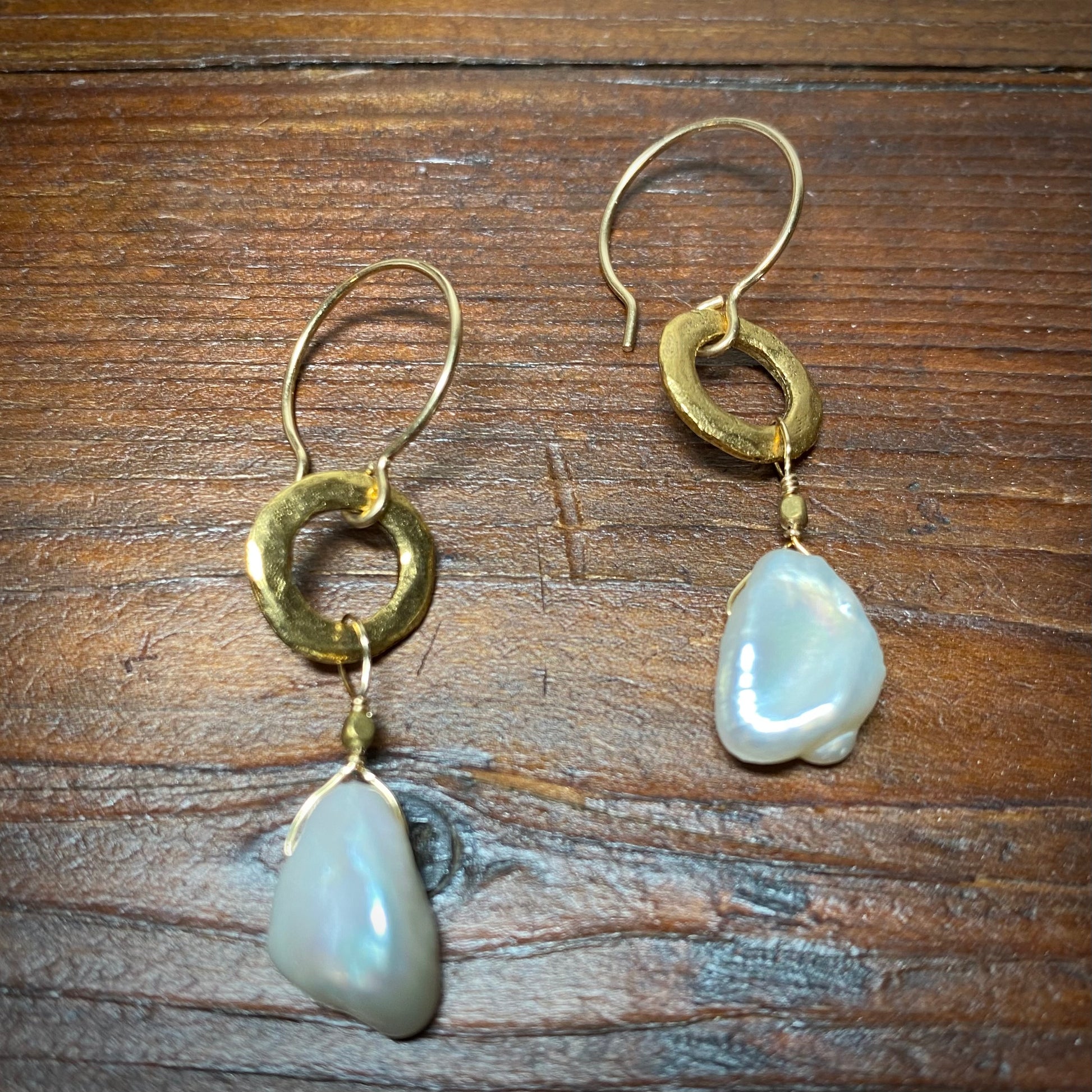 Elegant and sophisticated, lustrous keshi freshwater pearls dangle from hammered gold vermeil loops. Keshi pearls are one of a kind so size and shape may vary. 1.875" long. Made in USA