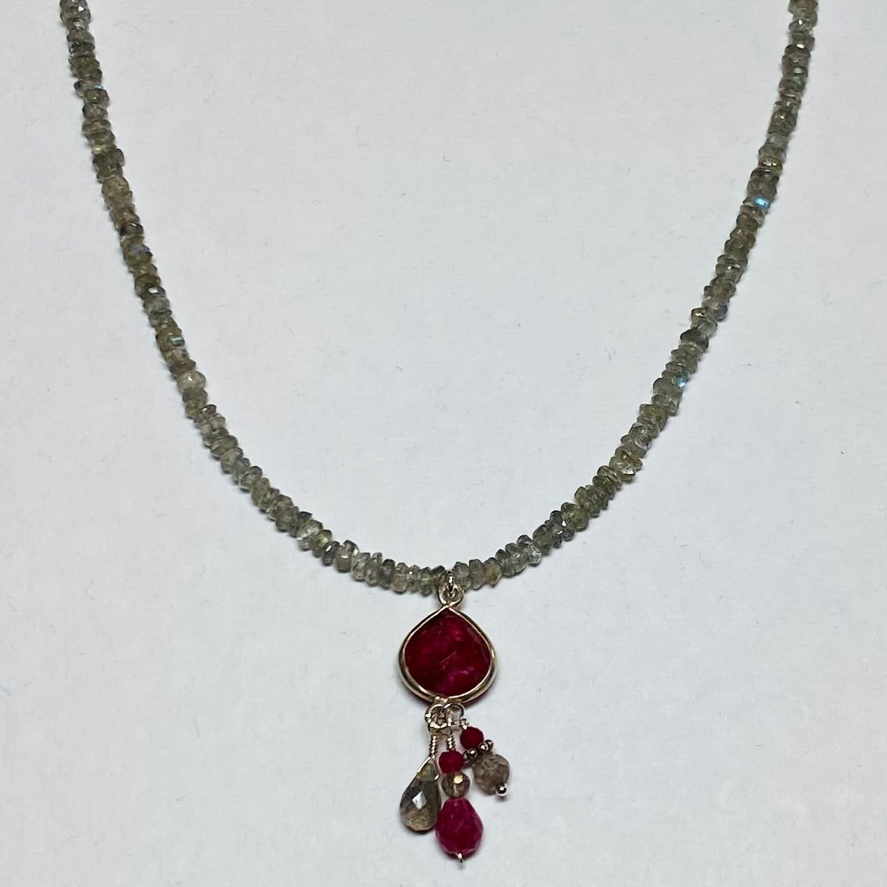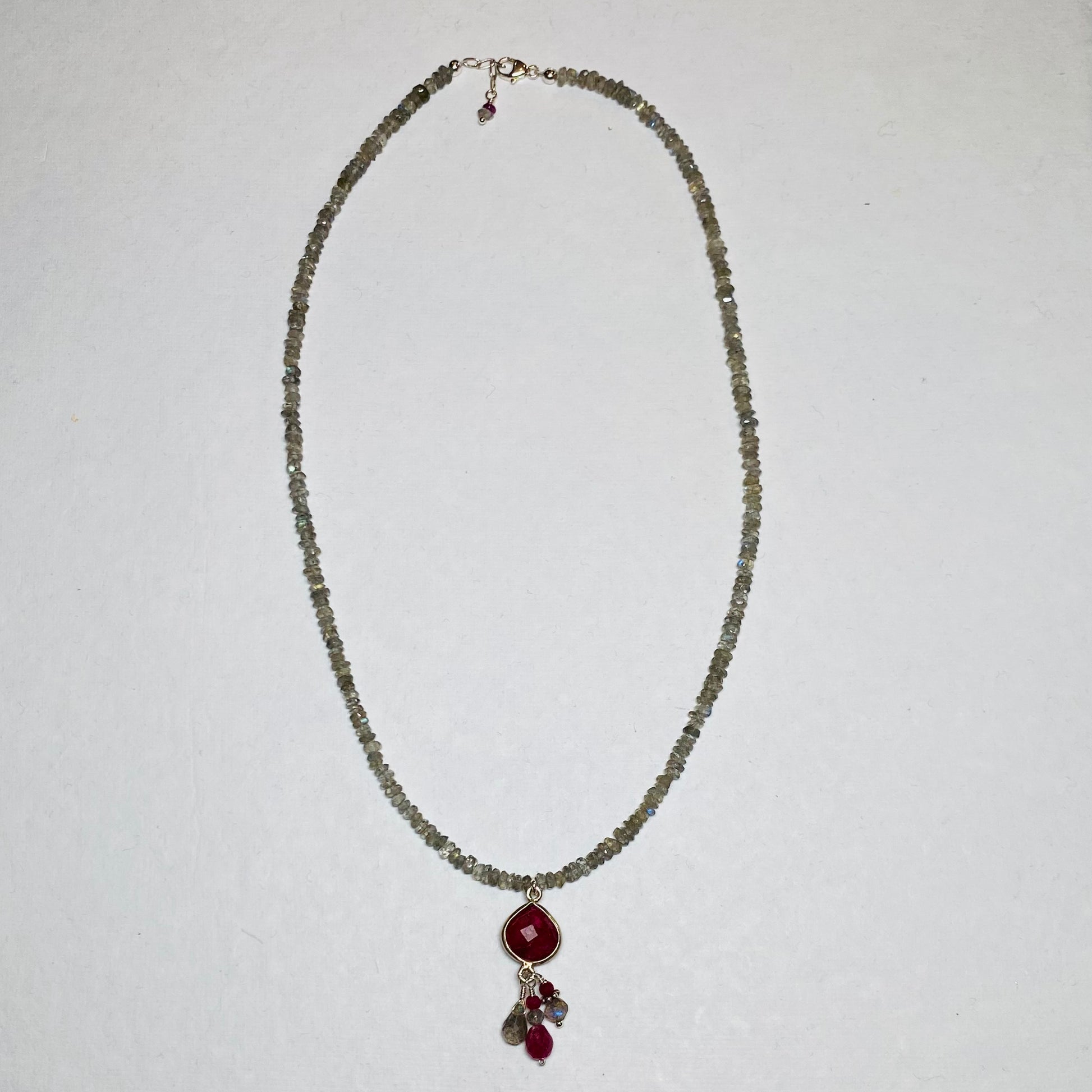 A ruby charm wrapped in sterling silver suspends from a string of sparkling hand cut Labradorite gemstones. Smaller gems of ruby and labradorite make a cluster as they dangle from the ruby charm. 16" - 18" long. Sterling silver lobster clasp and extension. Made in USA