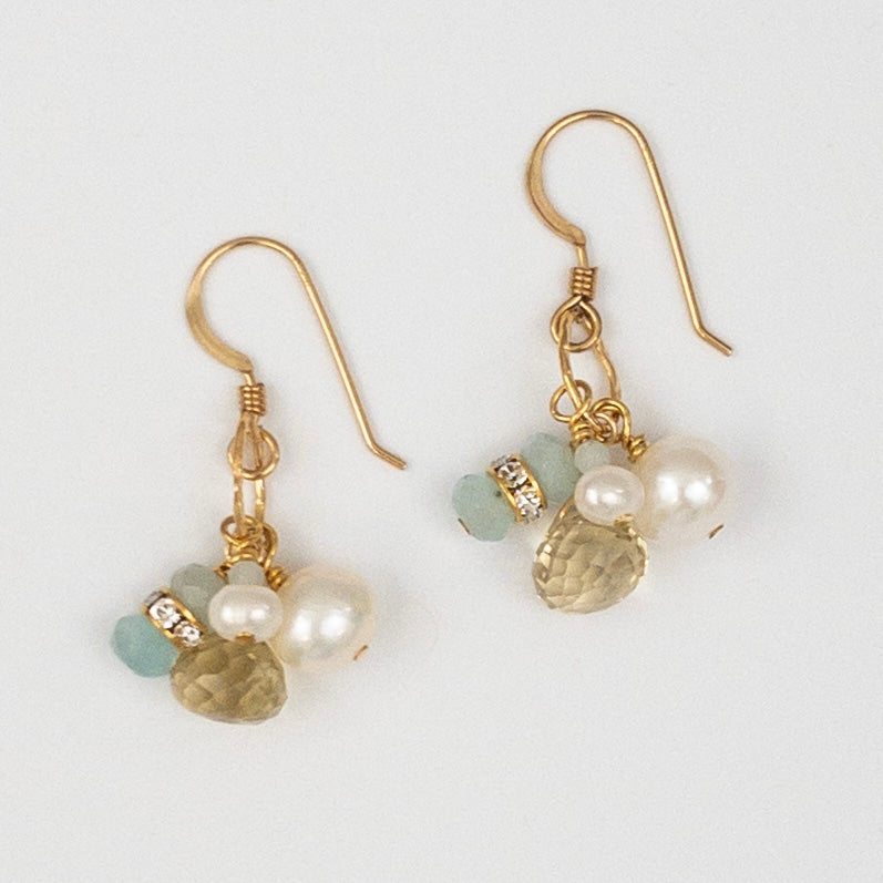 Add a touch of elegance with our Lemon Quartz Cascade Earrings. Aquamarine and pearls delicately cascade down a row of chain, leading to a faceted briolite Lemon Quartz gemstone. Elevate your style with these luxurious and exclusive earrings. 14K gold-filled findings. Made in USA. 1.25" long.