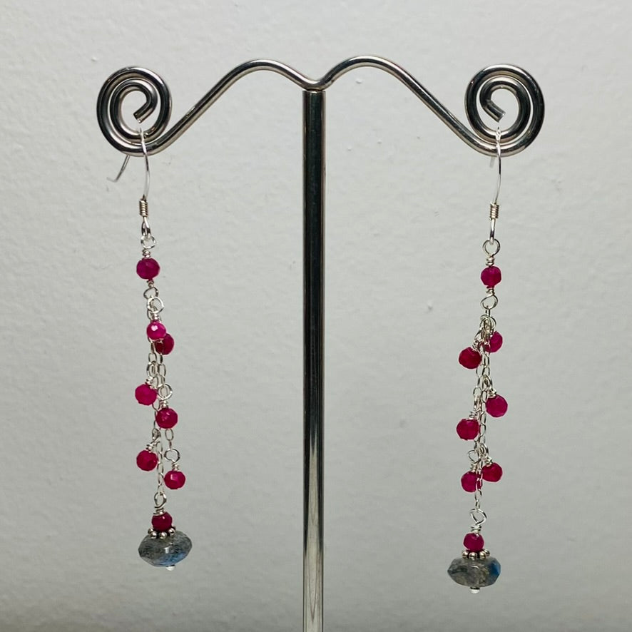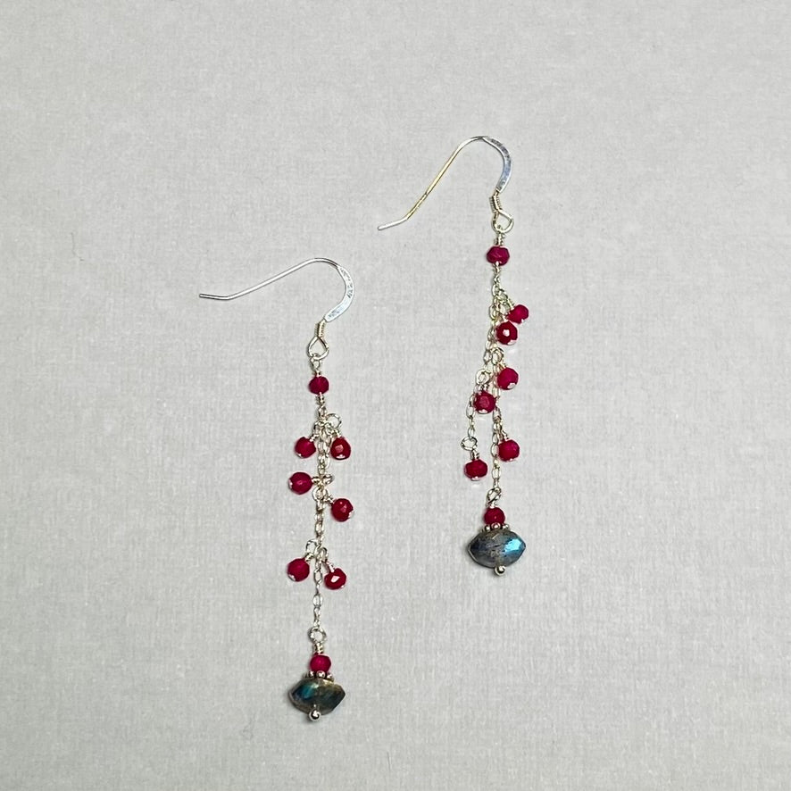 Indulge in luxury with our handcrafted Long Ruby and Labradorite Earrings. Experience the elegant cascade of tiny rubies delicately placed on a silver chain, leading to one stunning labradorite gem. Let these earrings add a touch of sophistication to any outfit. 2.5" long. Made in USA.