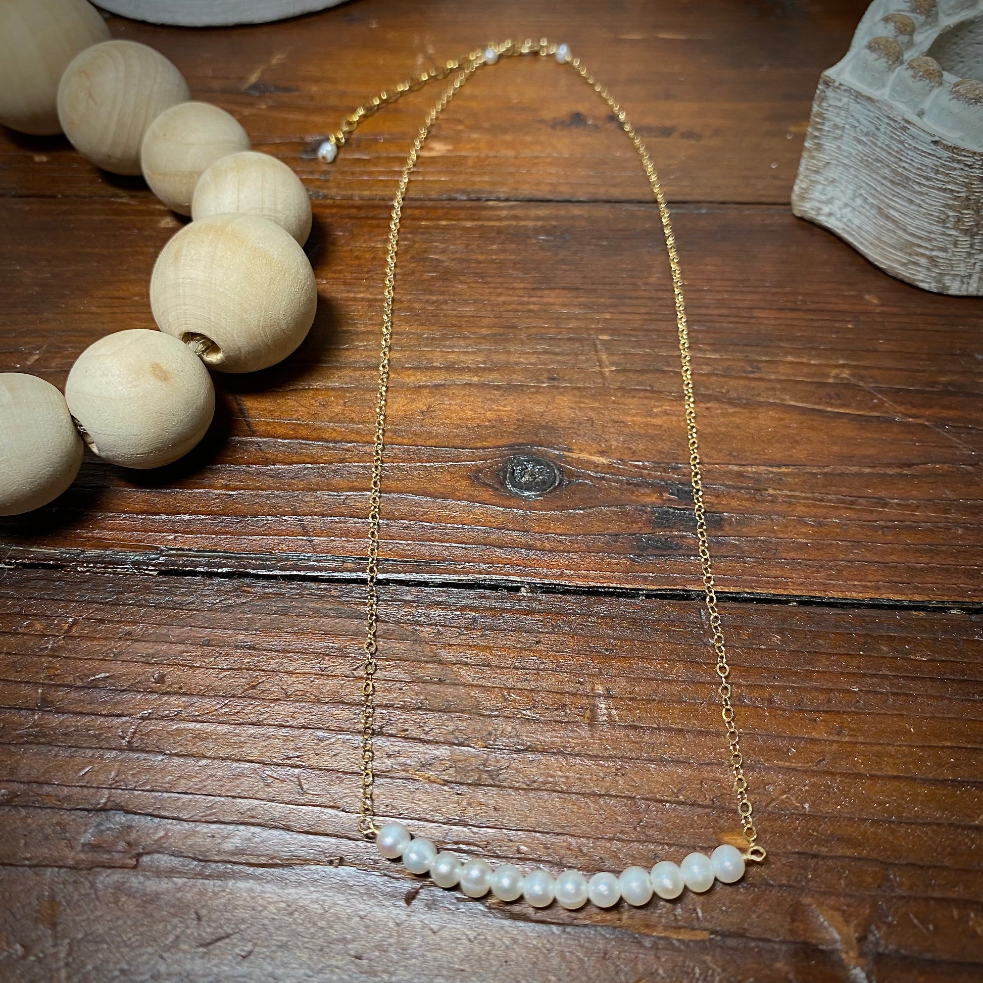 Elevate your style with our 14K gold-filled necklace featuring a bar of lustrous pearls. This elegant piece blends classic sophistication with modern charm, offering timeless allure for any occasion. Effortlessly versatile, it adds a touch of refinement to both casual and formal attire, making it an essential addition to your jewelry collection. 14K gold-filled spring clasp. Made in USA. 15" long with 2 " extension.