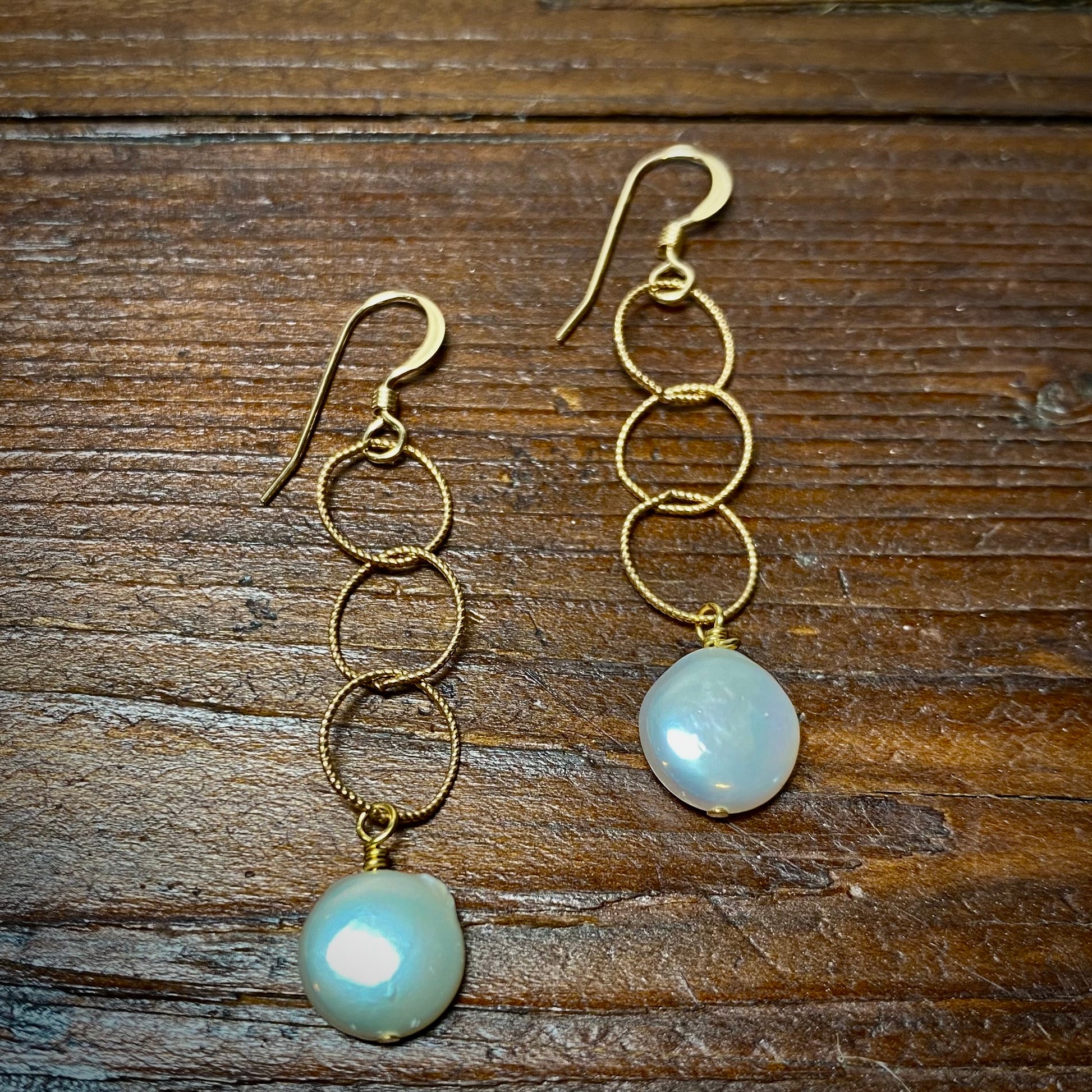 A trio of intricate gold textured round links delicately hold a single coin pearl in this timeless design with modern allure. 1.875" long. Made in USA.