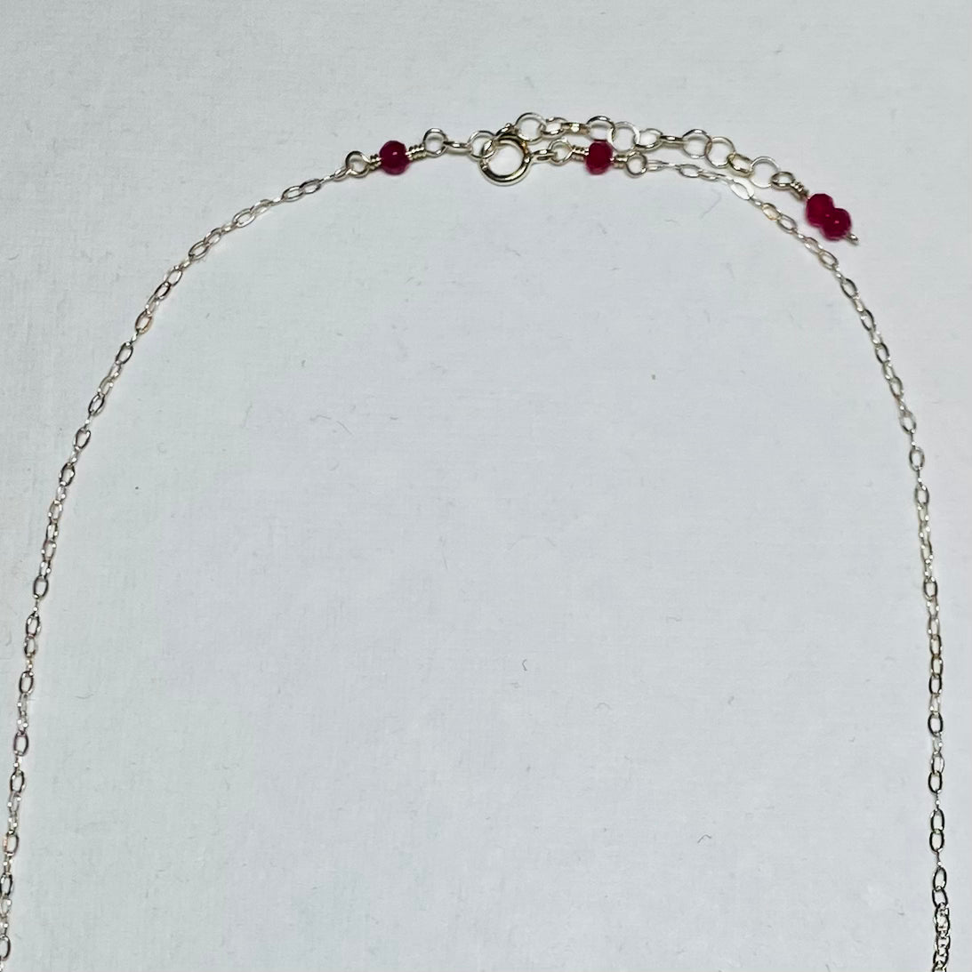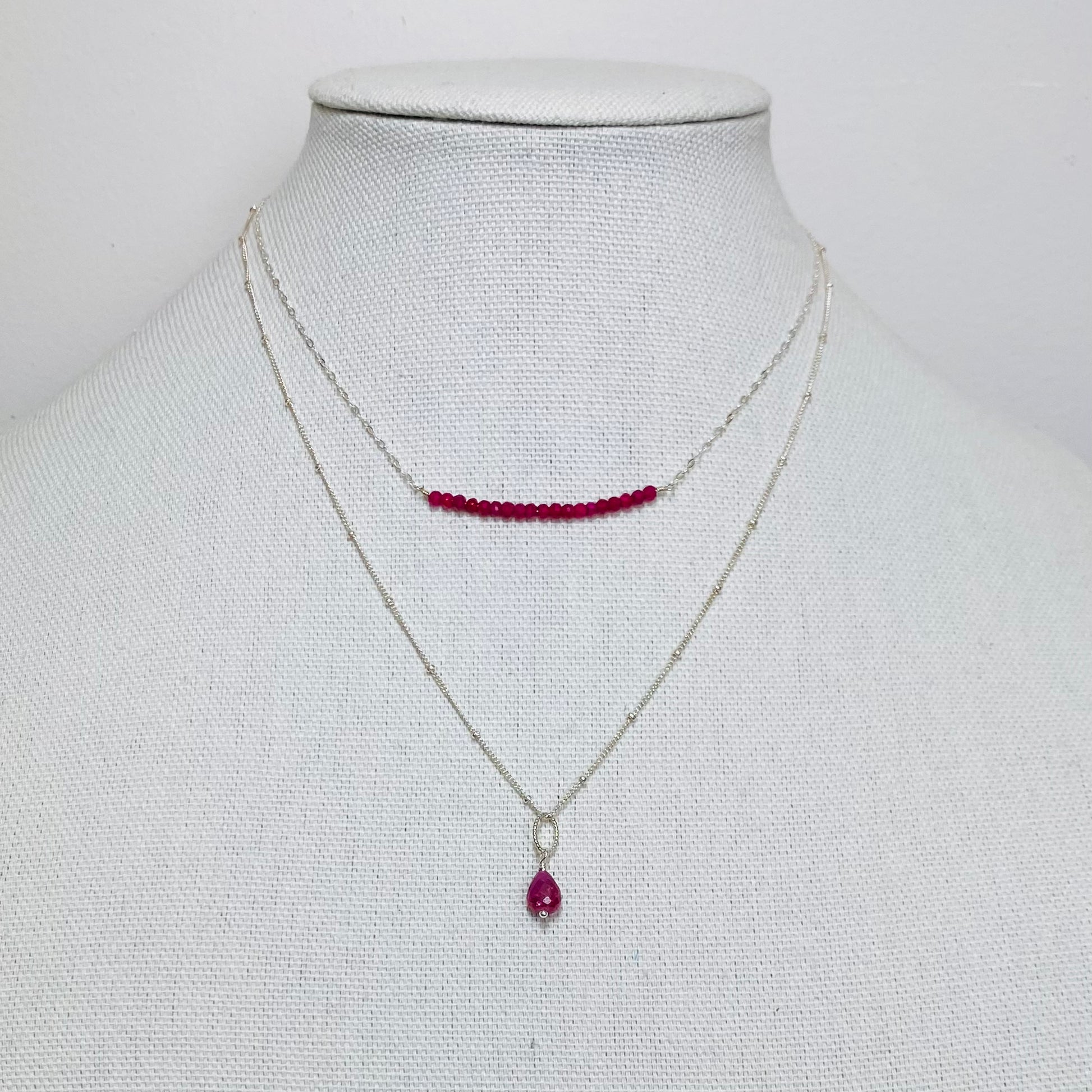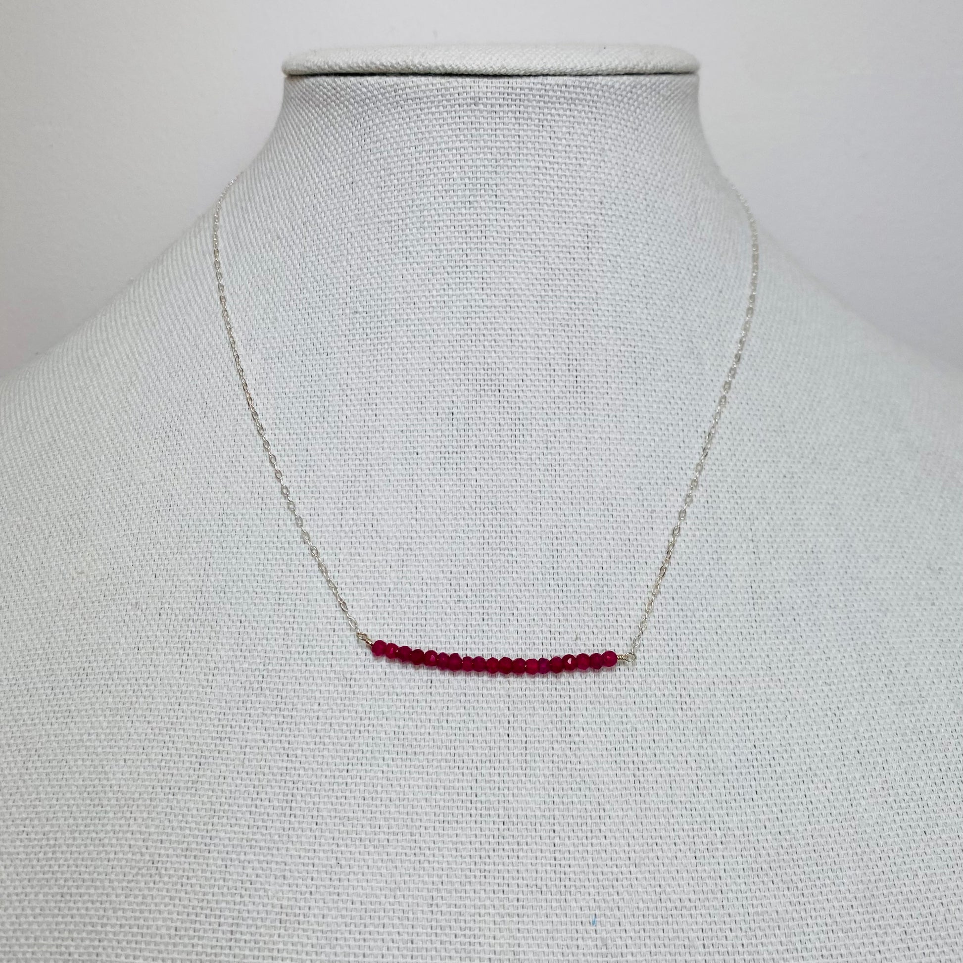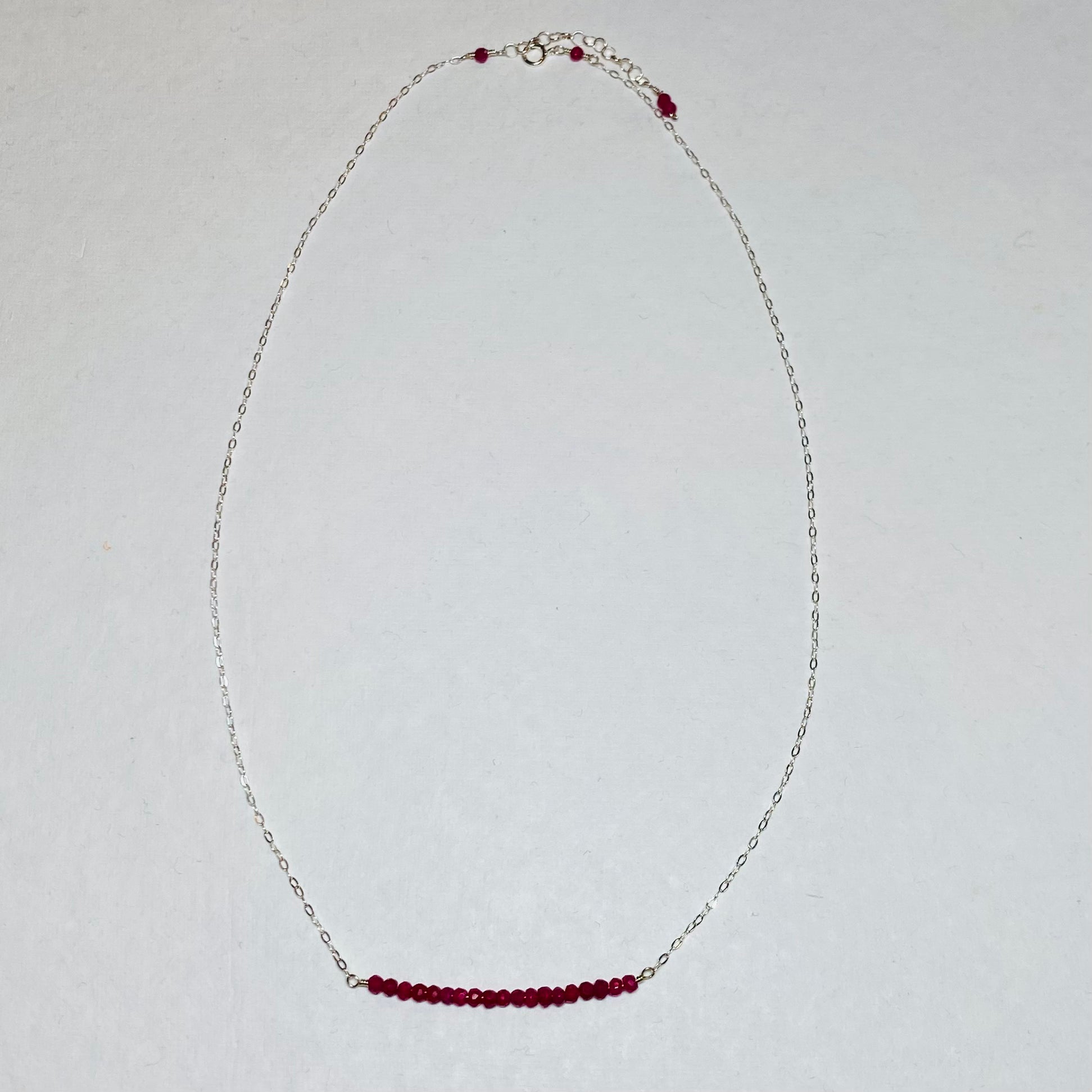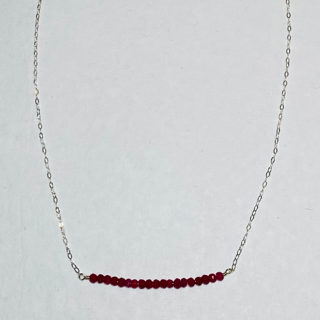 Add a touch of sophistication to your style with our Ruby and Sterling Silver Bar Necklace. This graceful piece features a stunning row of ruby gemstones, July's birthstone, strung on an elegant silver chain. Elevate any outfit effortlessly when you wear this piece alone or layered. Sterling silver spring clasp. Made in USA 16" long with 2" extension.