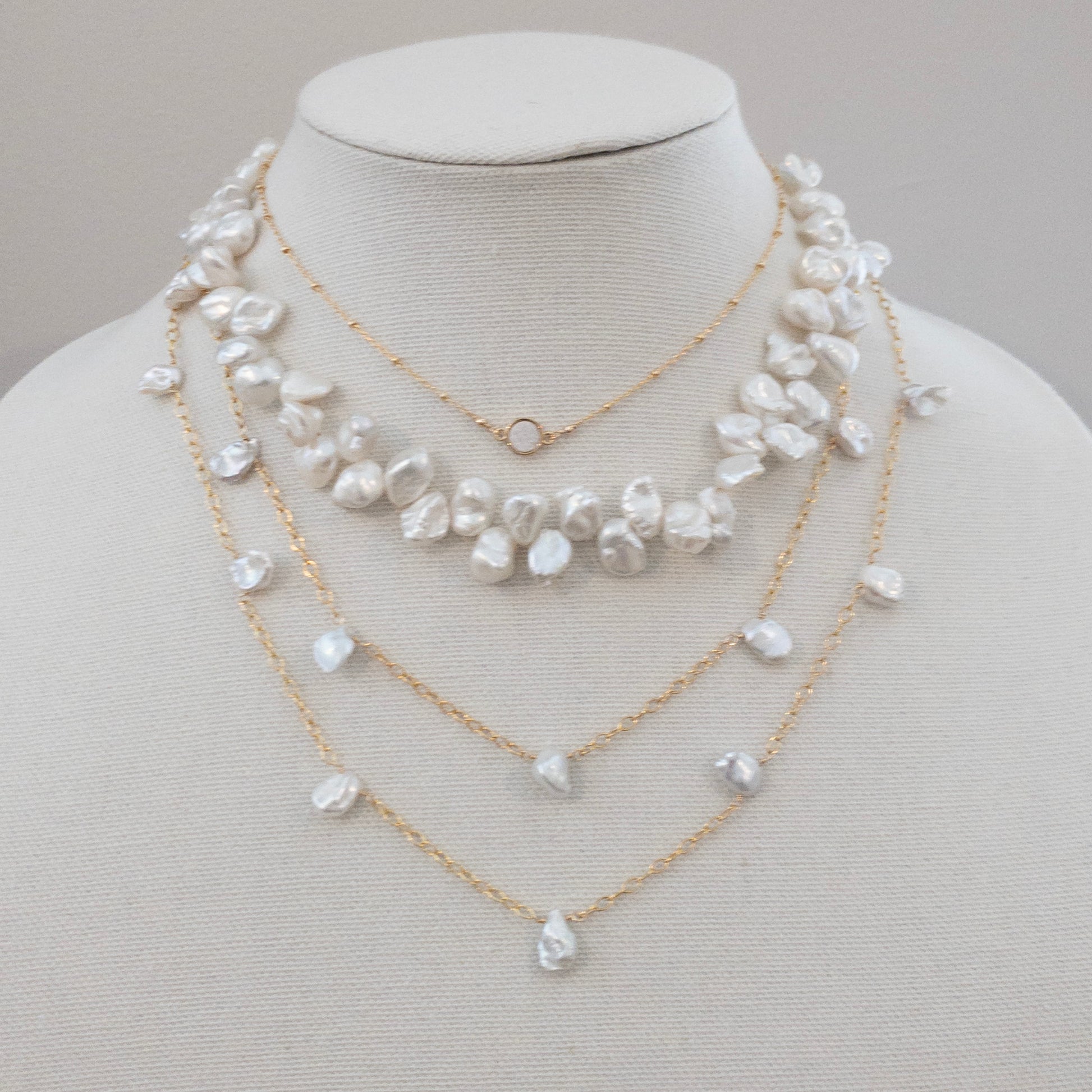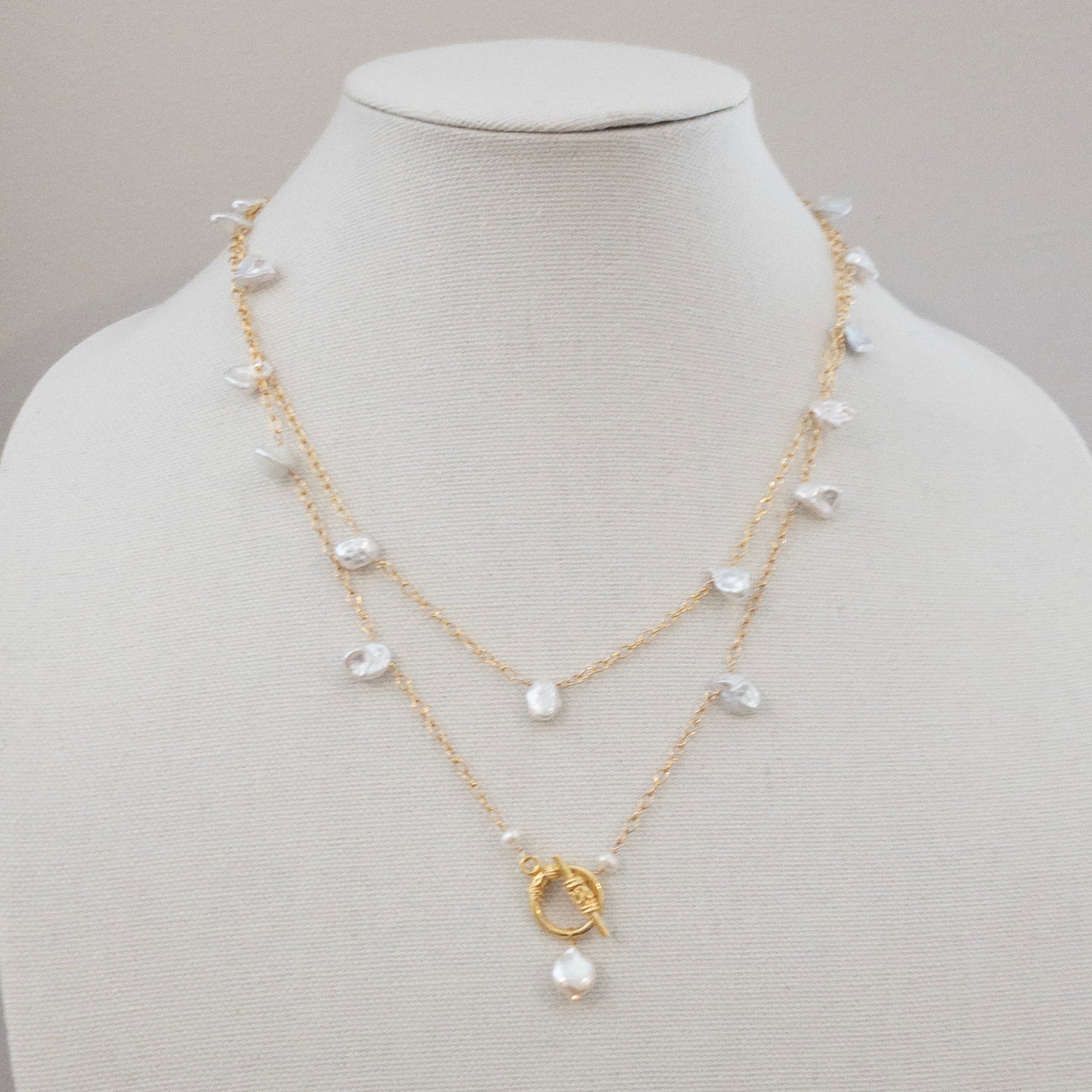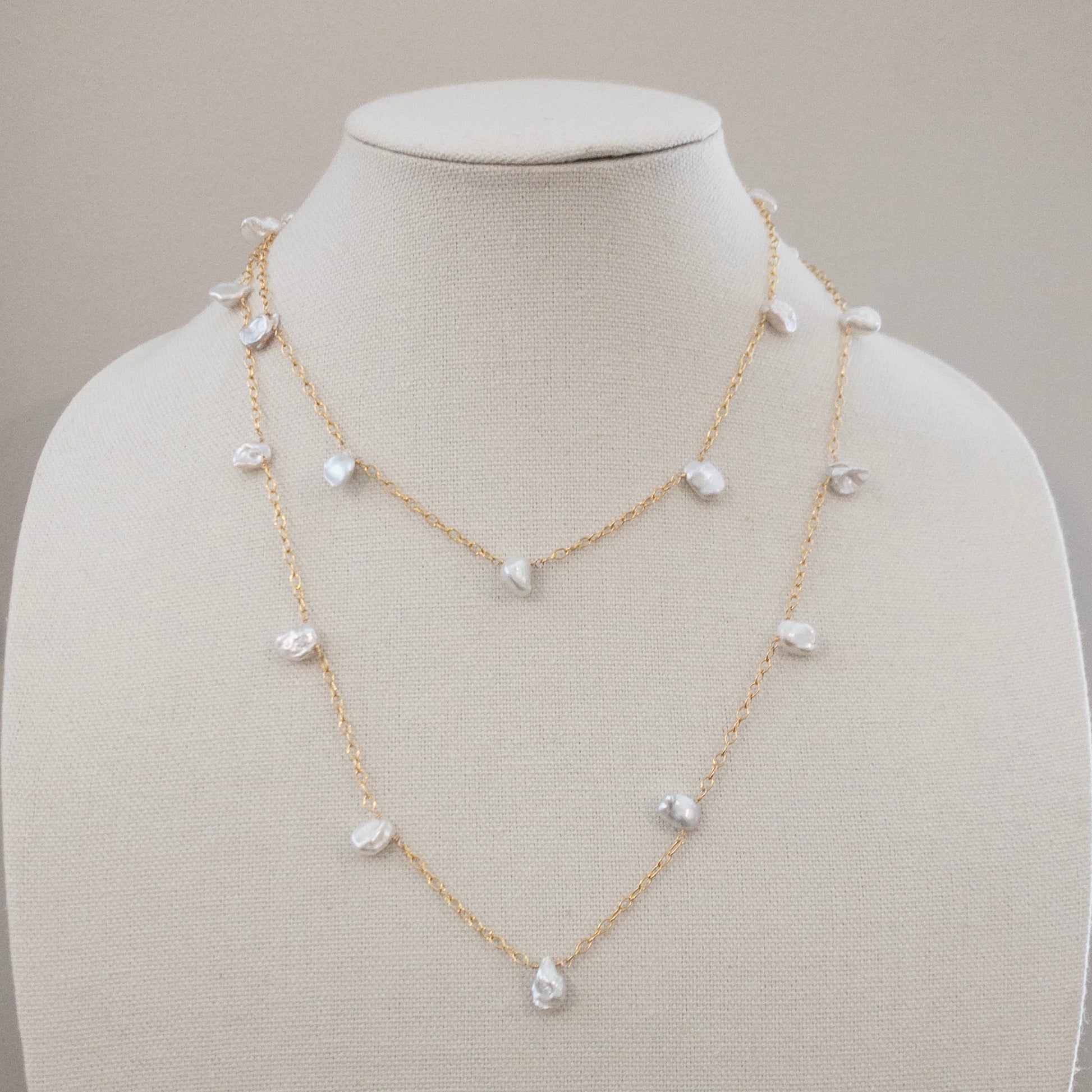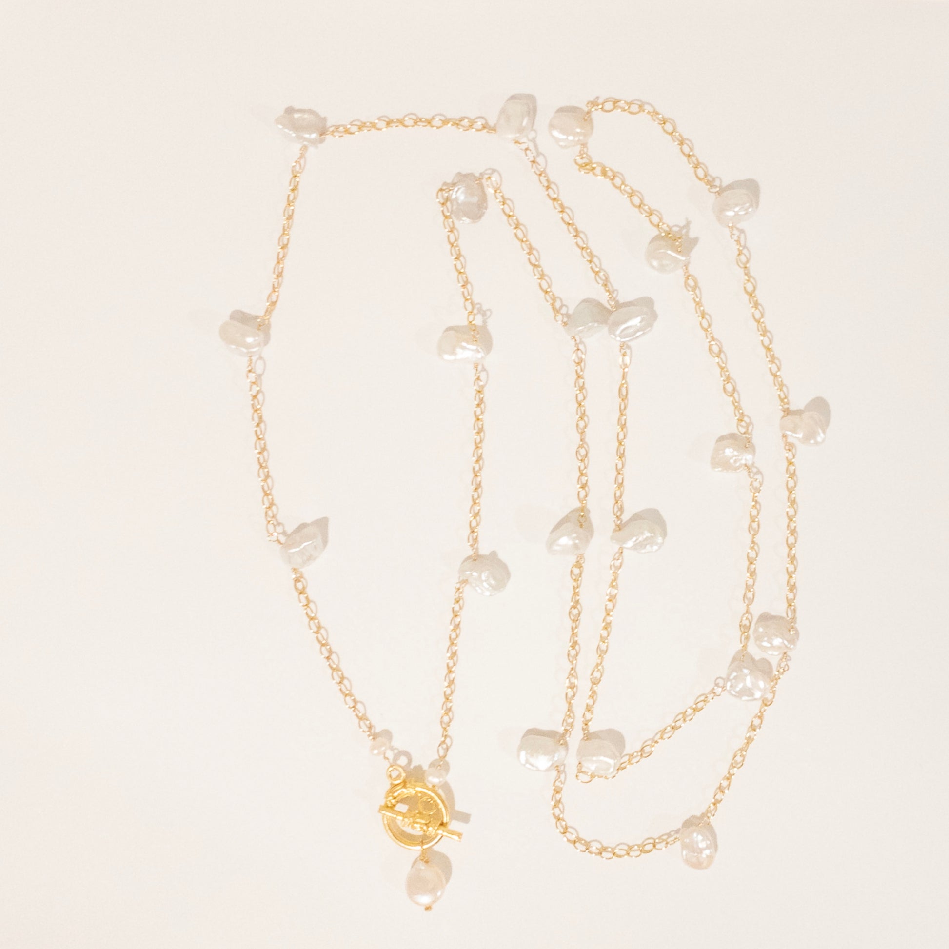 Indulge in luxury with our long layering piece adorned with exquisite Keshi pearls. This sophisticated addition to your wardrobe will elevate any outfit and exude an air of exclusivity and elegance. Perfect for a night out or adding a touch of glamour to your everyday look. Wear it long or wrapped. 14K gold-filled toggle clasp. Made in USA. 42" long.