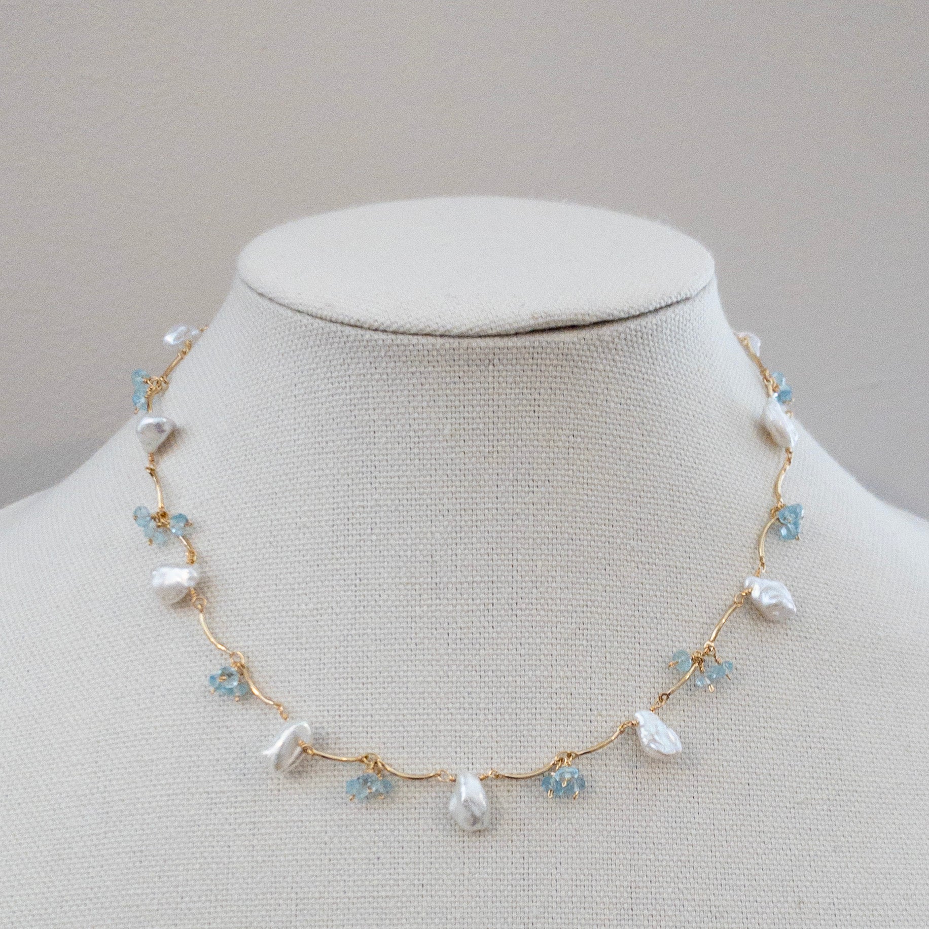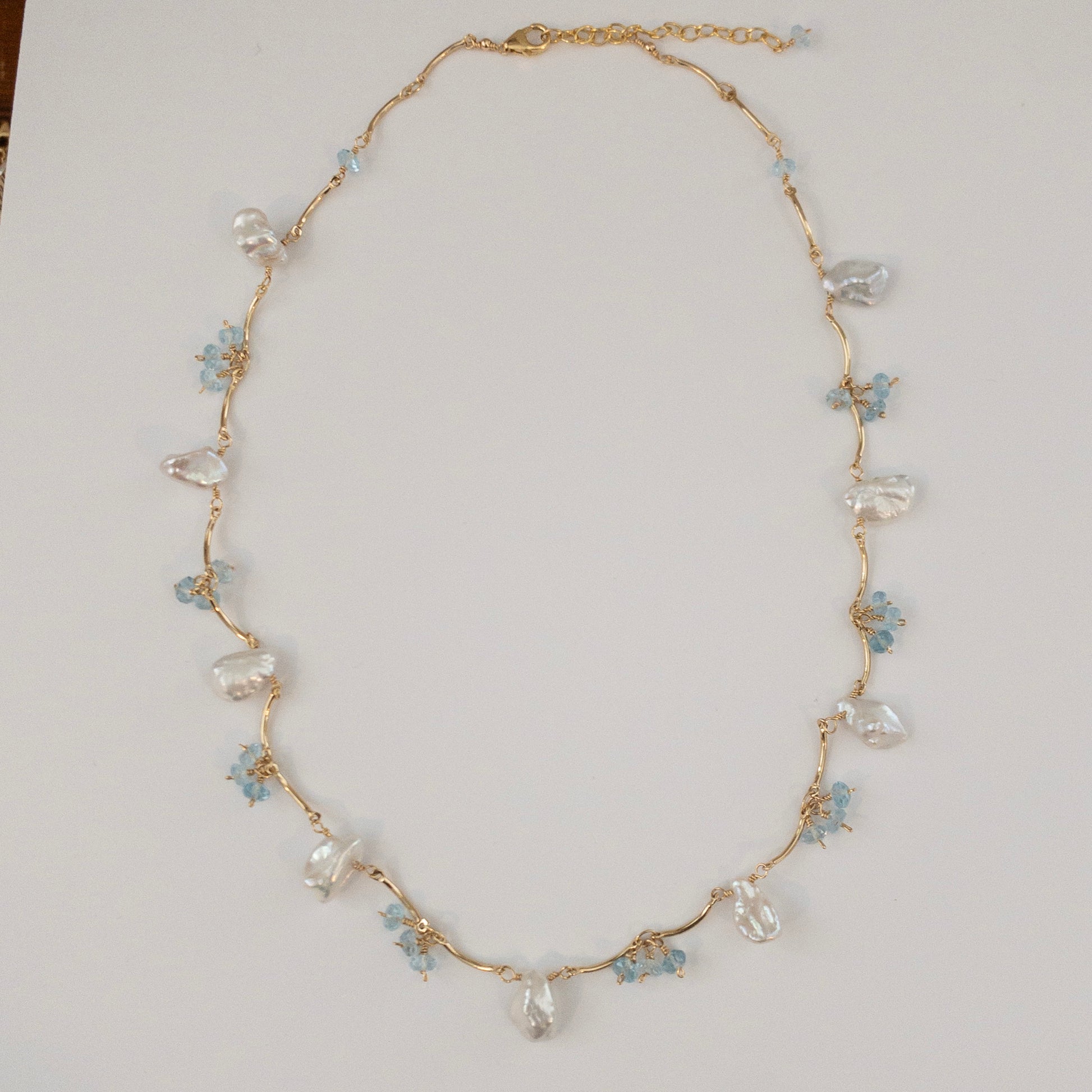 Indulge in the elegance and sophistication of our Seafoam Shores Necklace. Adorned with lustrous Keshi pearls and clusters of soothing aquamarine, this piece exudes luxury and exclusivity. Each pearl and gemstone is carefully spaced between the delicate gold curves of the bar chain, creating a beautifully refined and tasteful design. Elevate your style with this stunning accessory. 14K gold-filled lobster clasp. Made in USA. 16" long with 2" extension.
