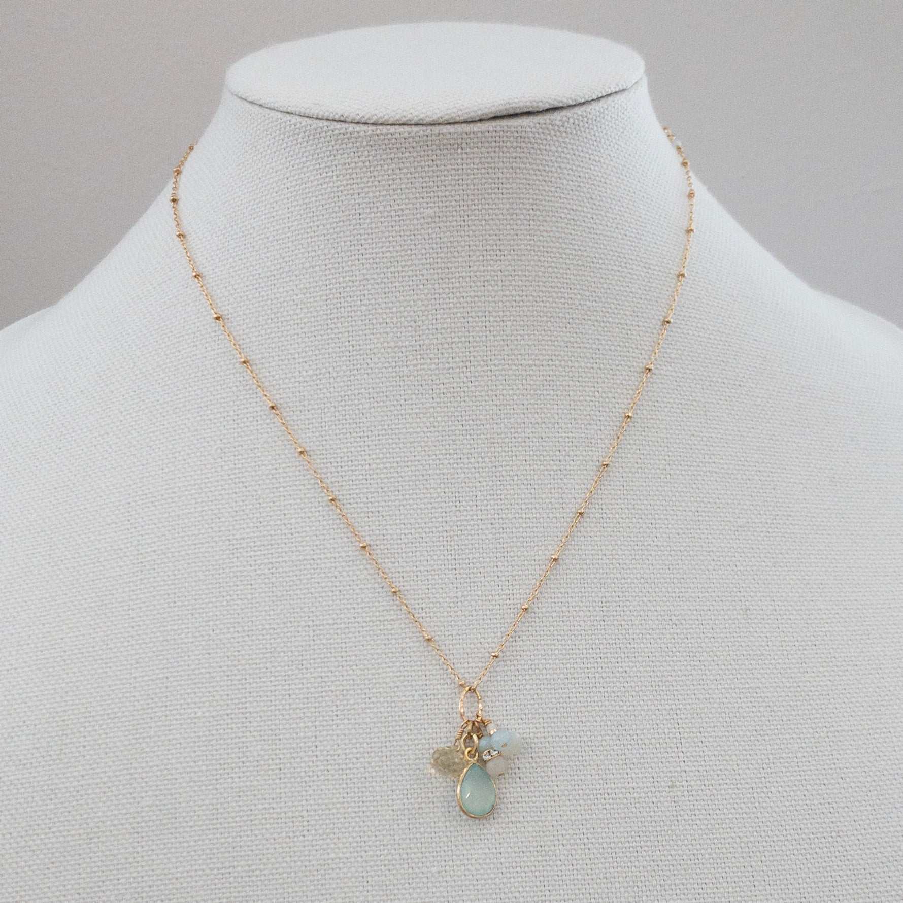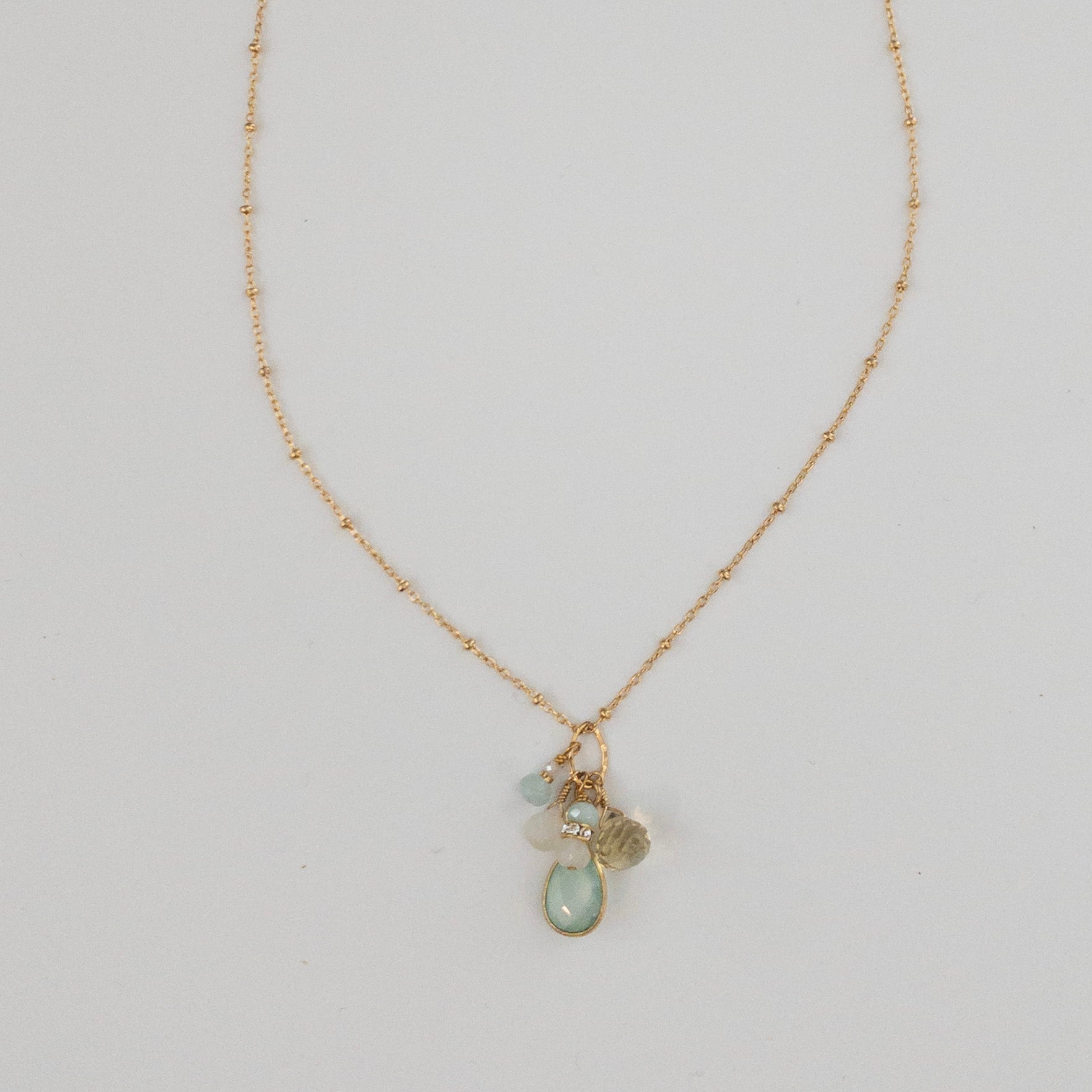 Indulge in the exquisite elegance of our Shallow Water Gem Cluster. A stunning showcase of pearls, aquamarine, chalcedony, lemon quartz, moonstone, and rhinestone, delicately dangling from a gold satellite chain. Enhance any outfit with this luxurious statement piece, perfect for any occasion. Elevate your style with this exclusive gem cluster. 14K gold-filled spring clasp. Made in USA. 16" long with 1" drop and 2" extension.