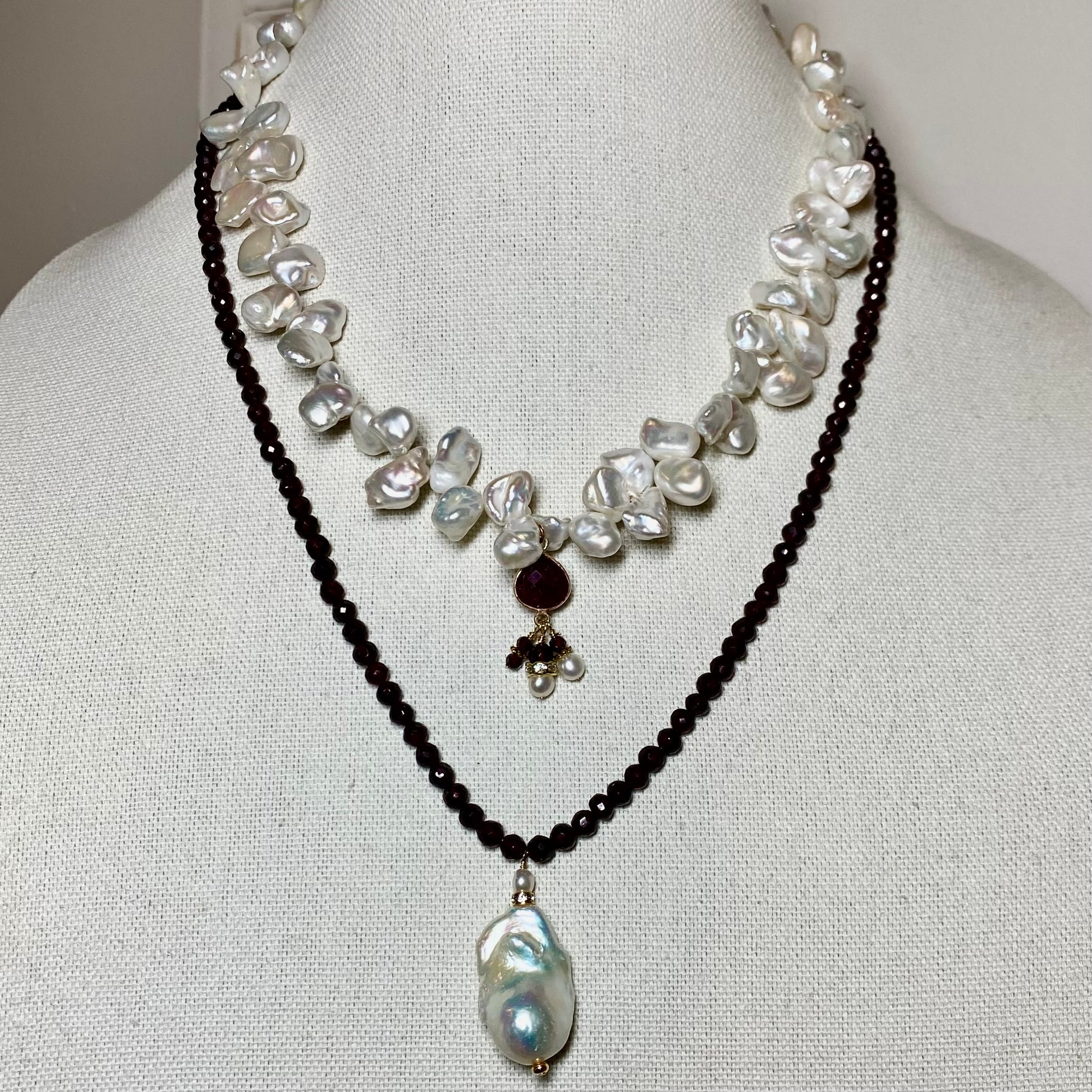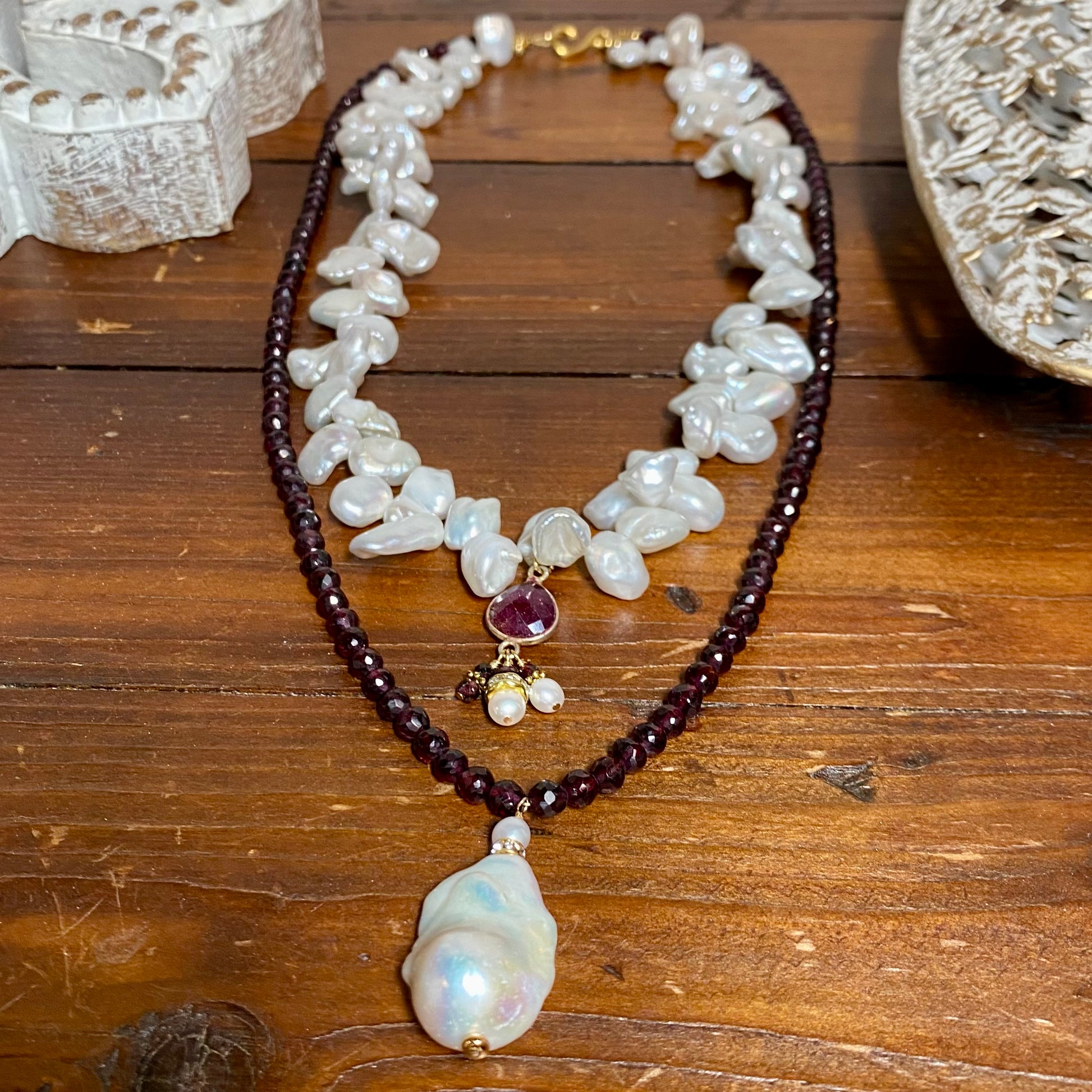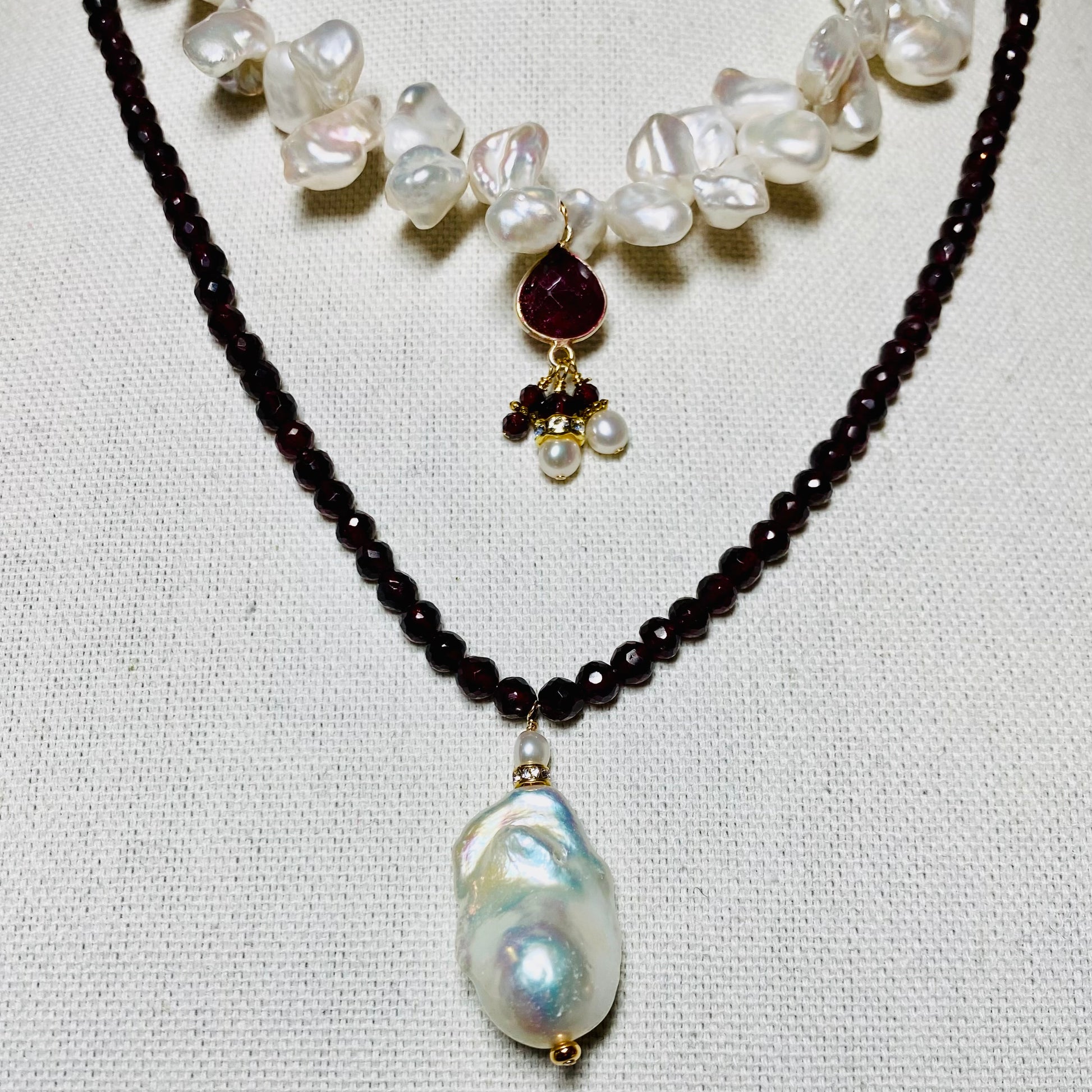 A stunning statement piece! Heads will turn when you wear this beautiful layered necklace - one of faceted garnet and the other keshi pearls, each with their own focal piece. A unique baroque pearl on the garnet and a cluster of garnet and pearls centered on the Keshi pearls. Gold vermeil toggle clasp. Made in USA. 23" long with 1.5" drop.