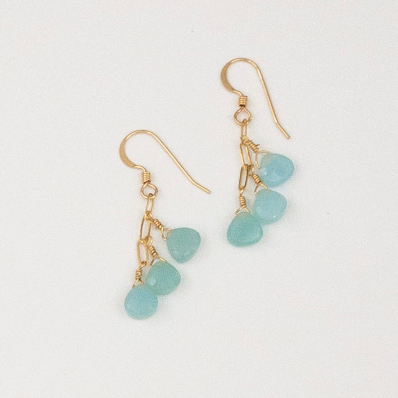 Indulge in the luxurious Trio of Chalcedony Earrings. These exquisite earrings feature a trio of chalcedony teardrops delicately cascading down a gold paperclip chain. Elevate any outfit with this elegant and exclusive piece that alludes to the world of art and fashion. All findings are 14K gold-filled. Made in USA. 1.5" long.